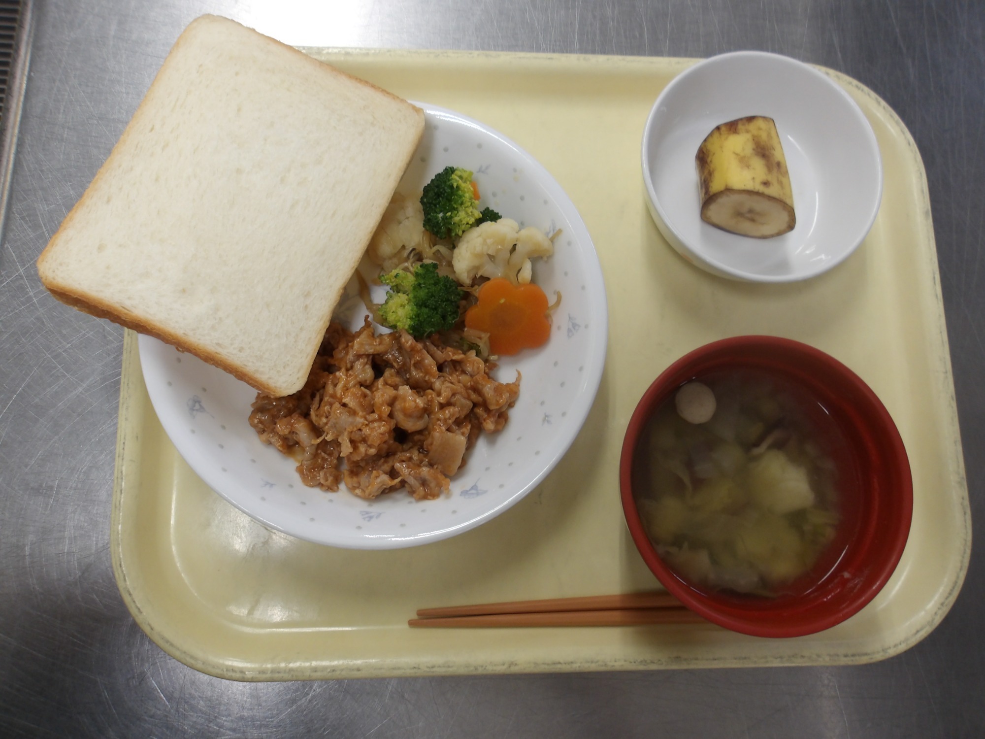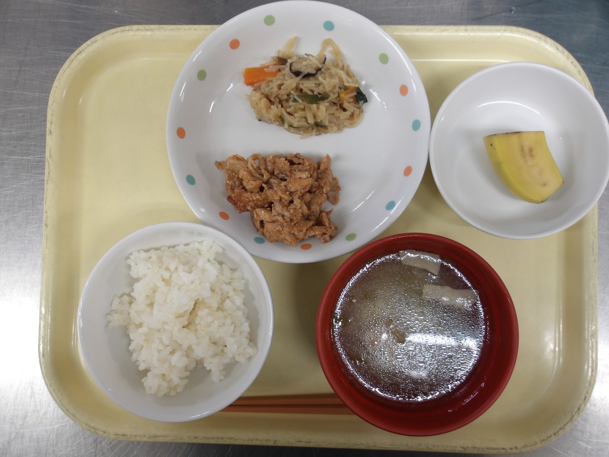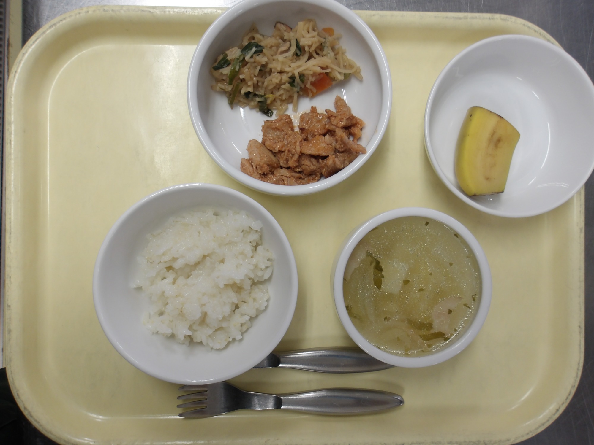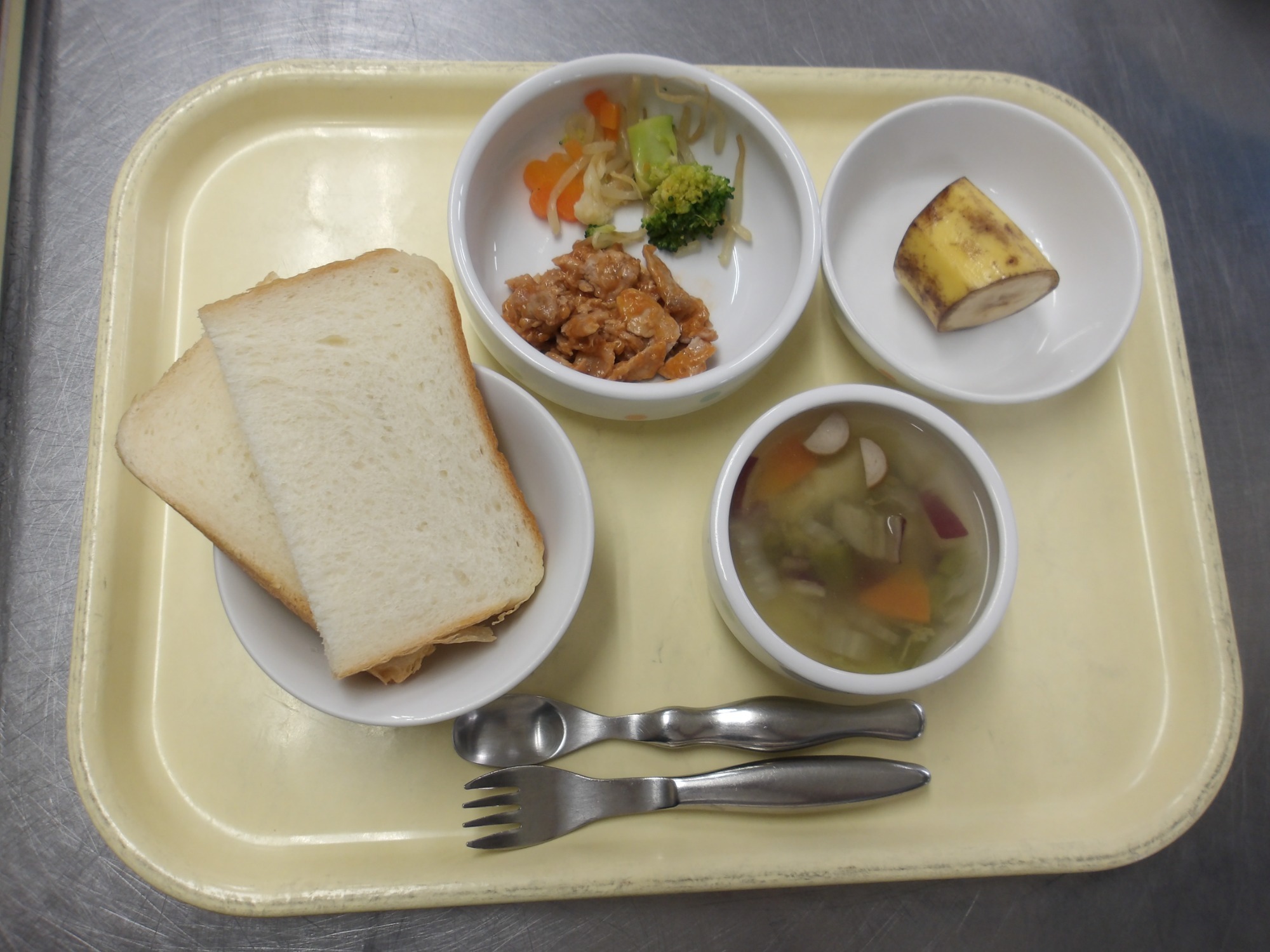 ごはん ポークチャップ 五目ビーフン ペイザンヌスープ バナナ おやつ:きな粉サンド