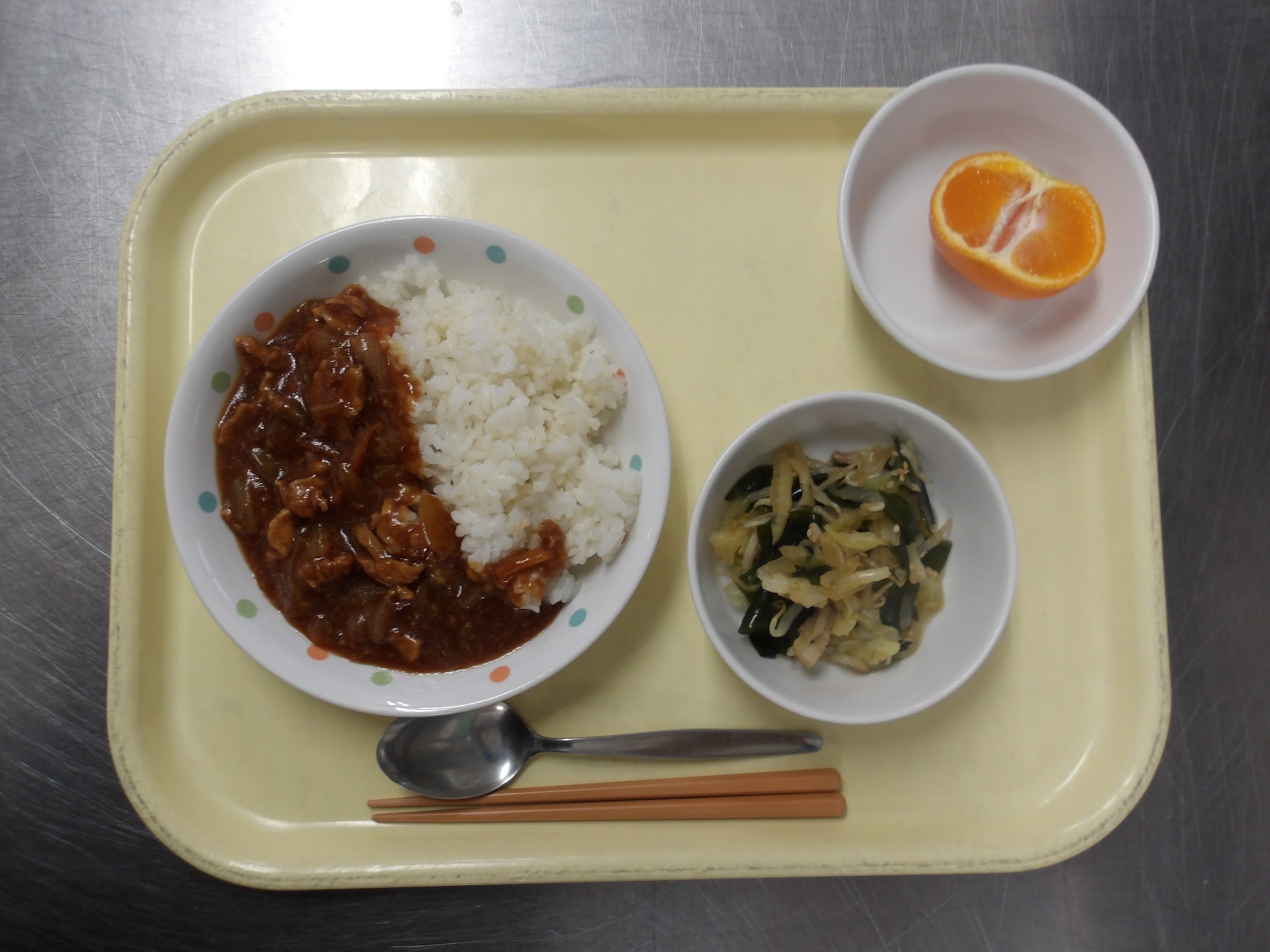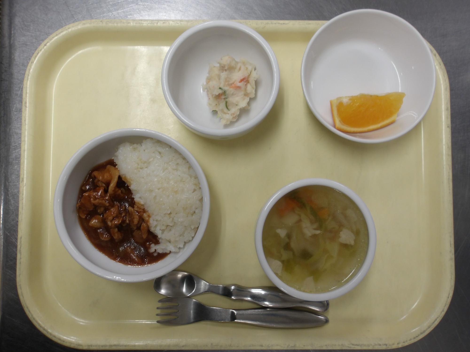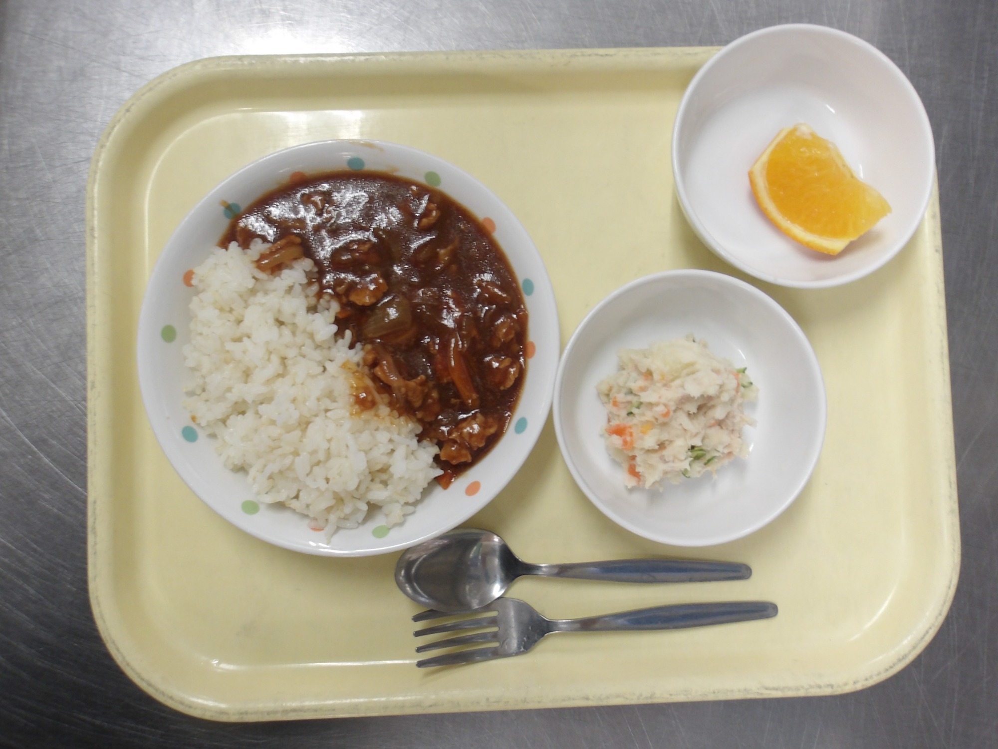 ハヤシライス ポテトサラダ ナーサリーのみ:野菜スープ おやつ:幼稚園の夏みかんのマーマレードいり米粉のケーキ