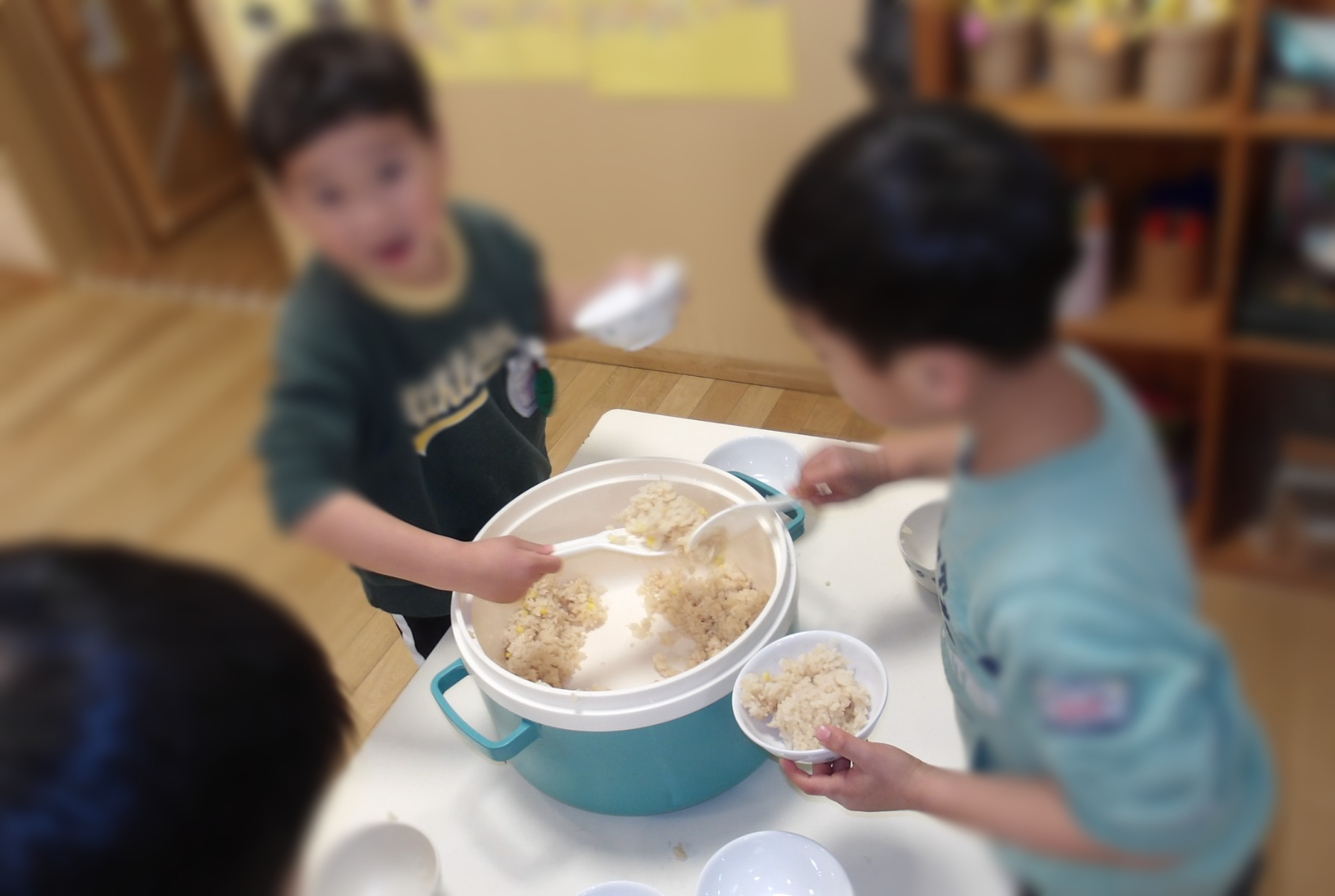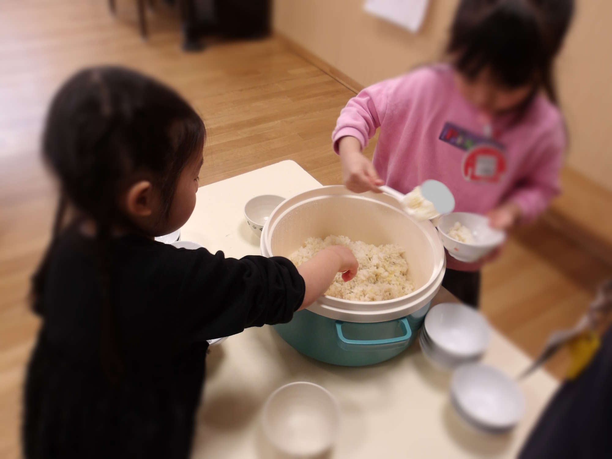 随分と慣れた様子なご飯の盛り付け。 自分で食べきれる量を食べきれるだけ盛りつけます。おうちでも練習してごはん盛り名人に なってね!!