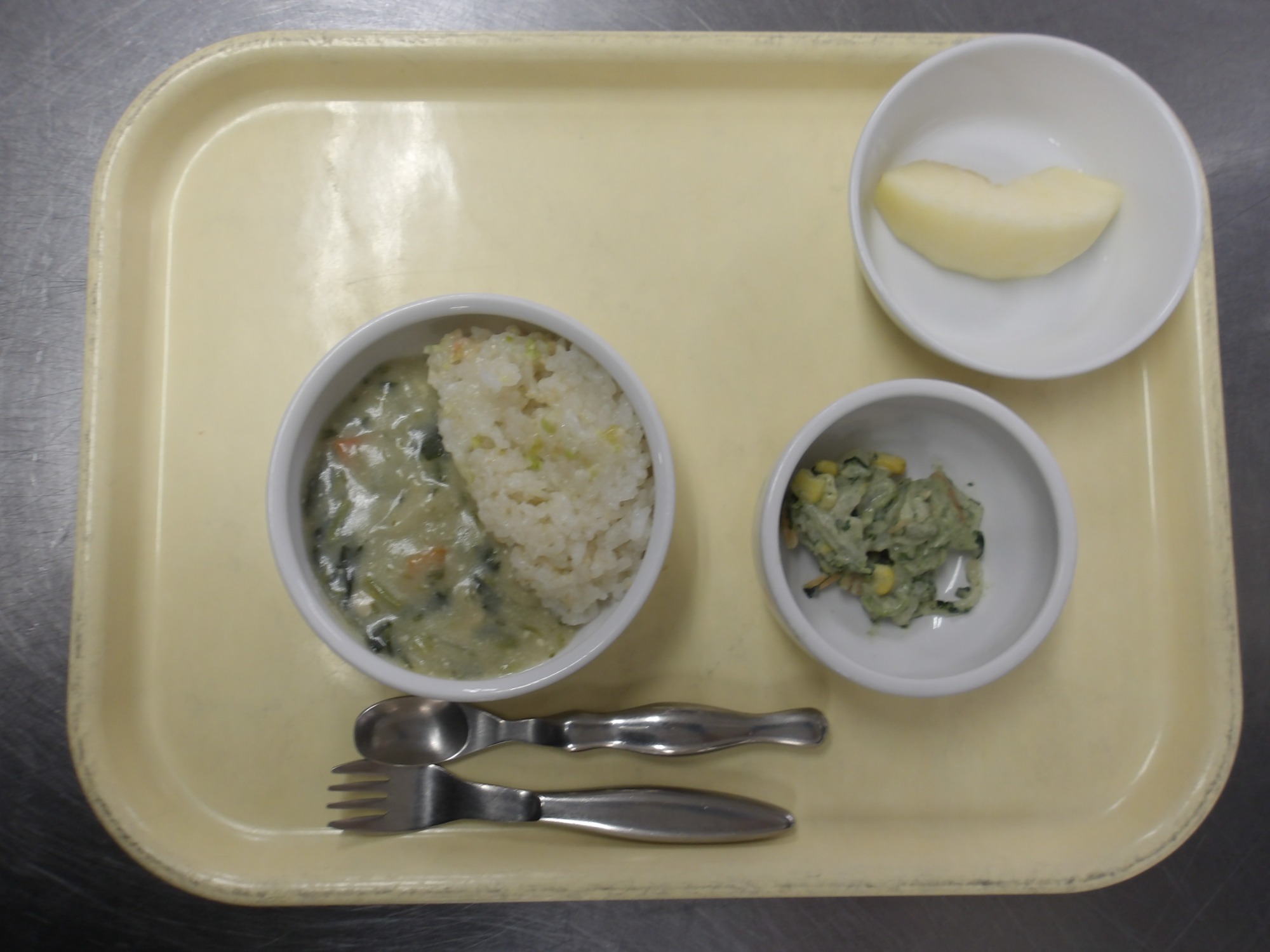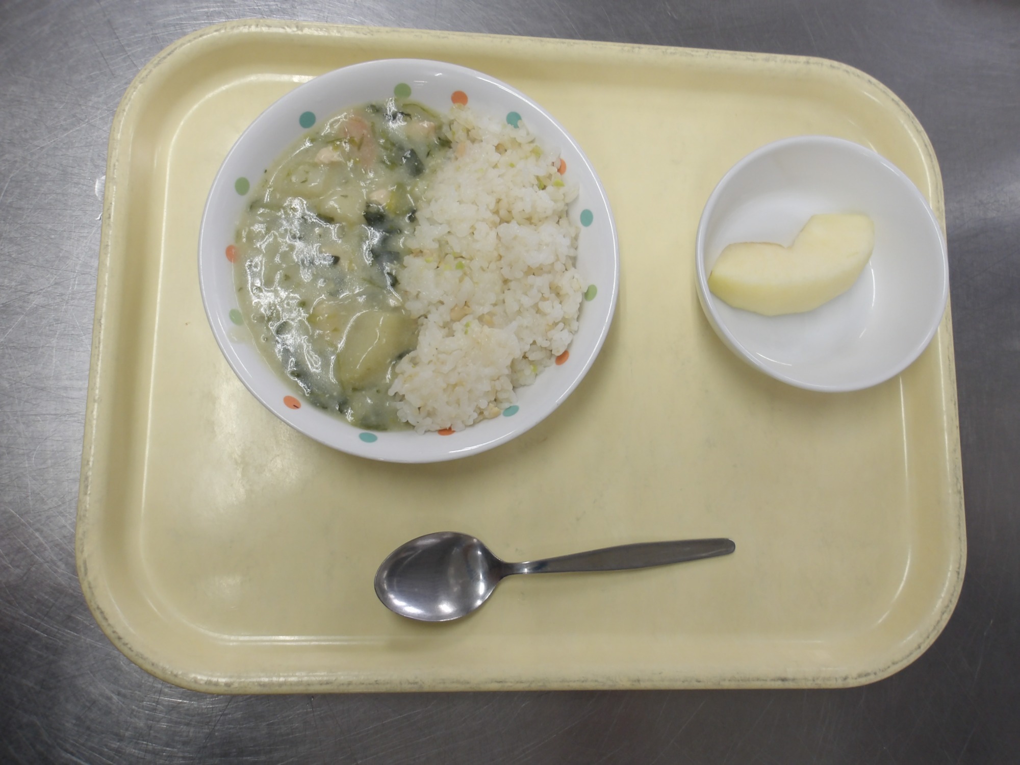 豆ごはんのクリームシチューがけ りんご ナーサリー:長いものサラダ おやつ:芋もち
