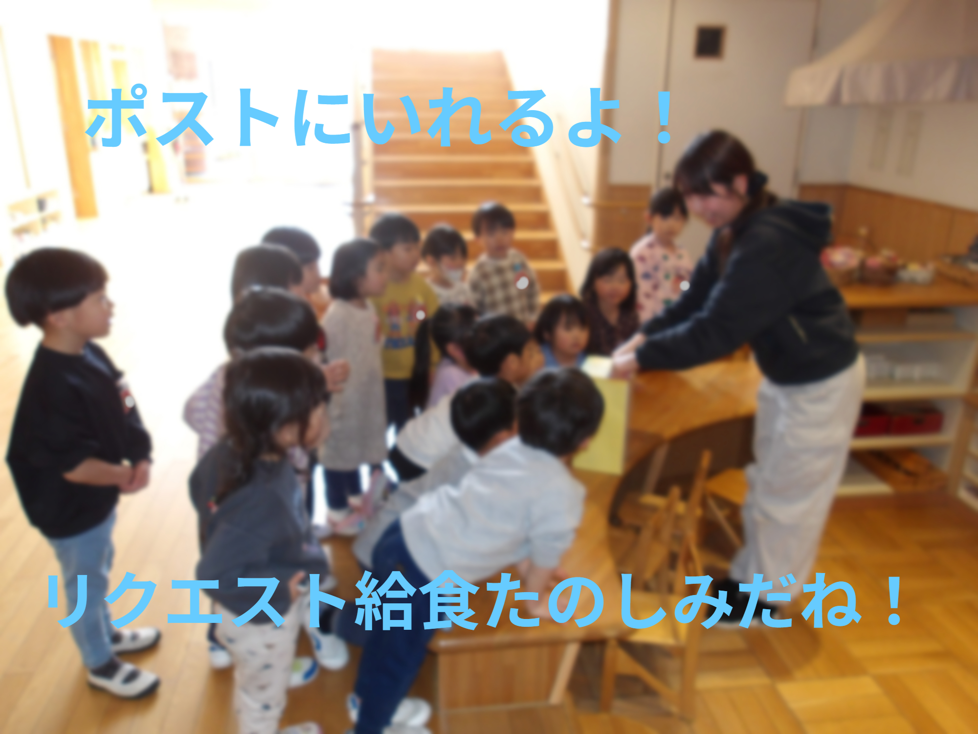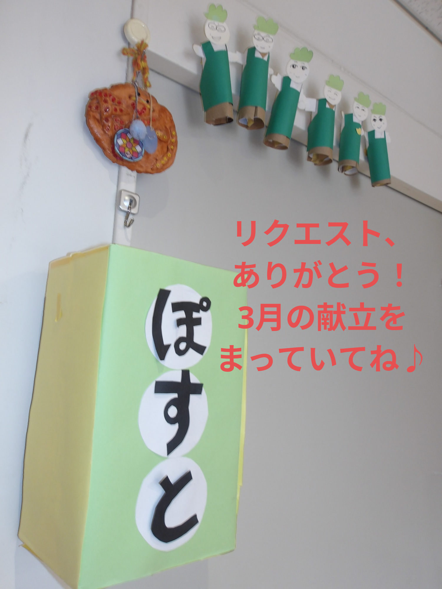 お帰りの時間に届けてくれたゆり組さんに遭遇3月のリクエスト給食、楽しみにしていてね!