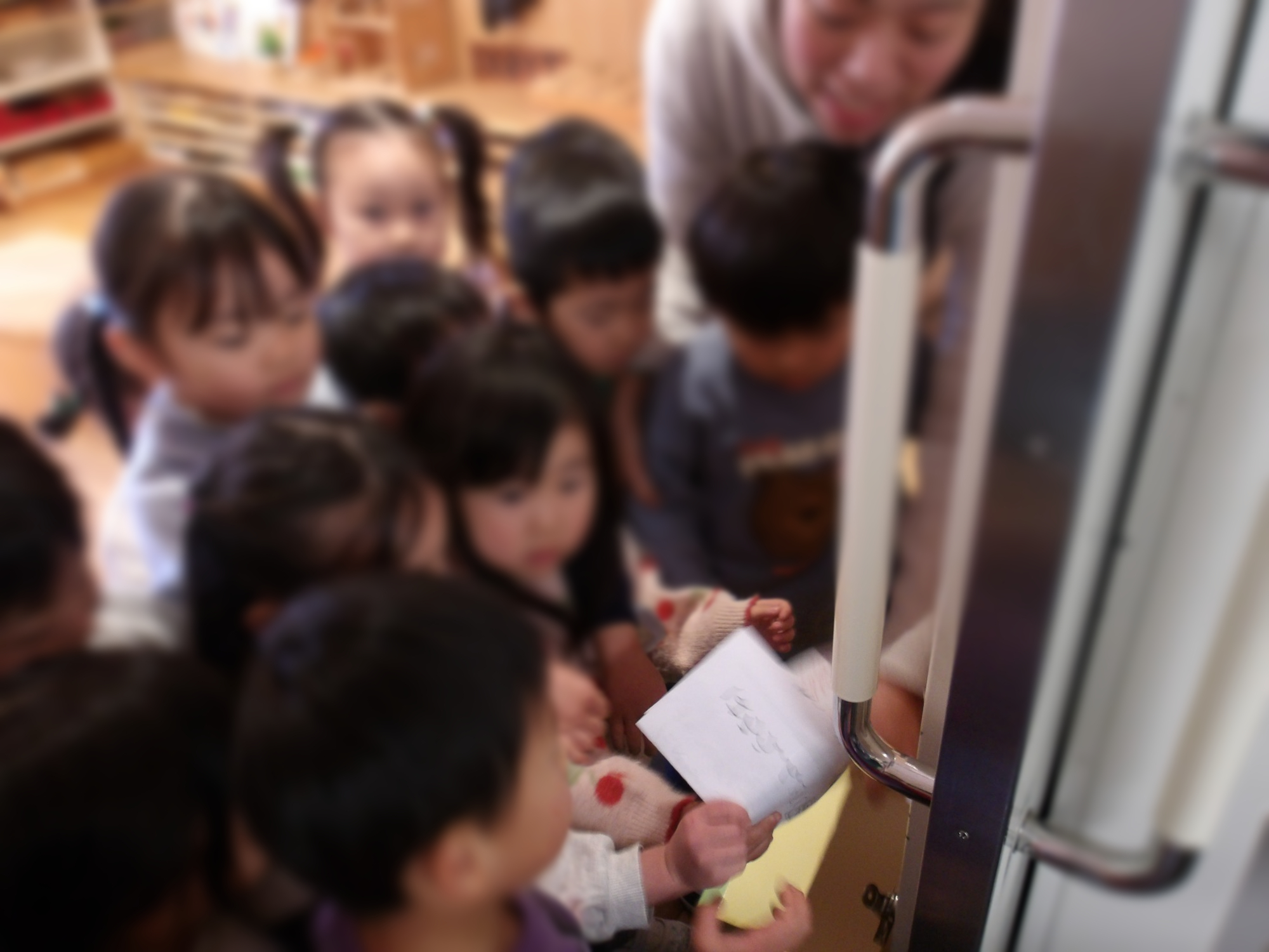 きょうは年長すみれ組さんがお手紙を届けてくれました!いつ行こうかなあ…? お手紙お返事待っててね!