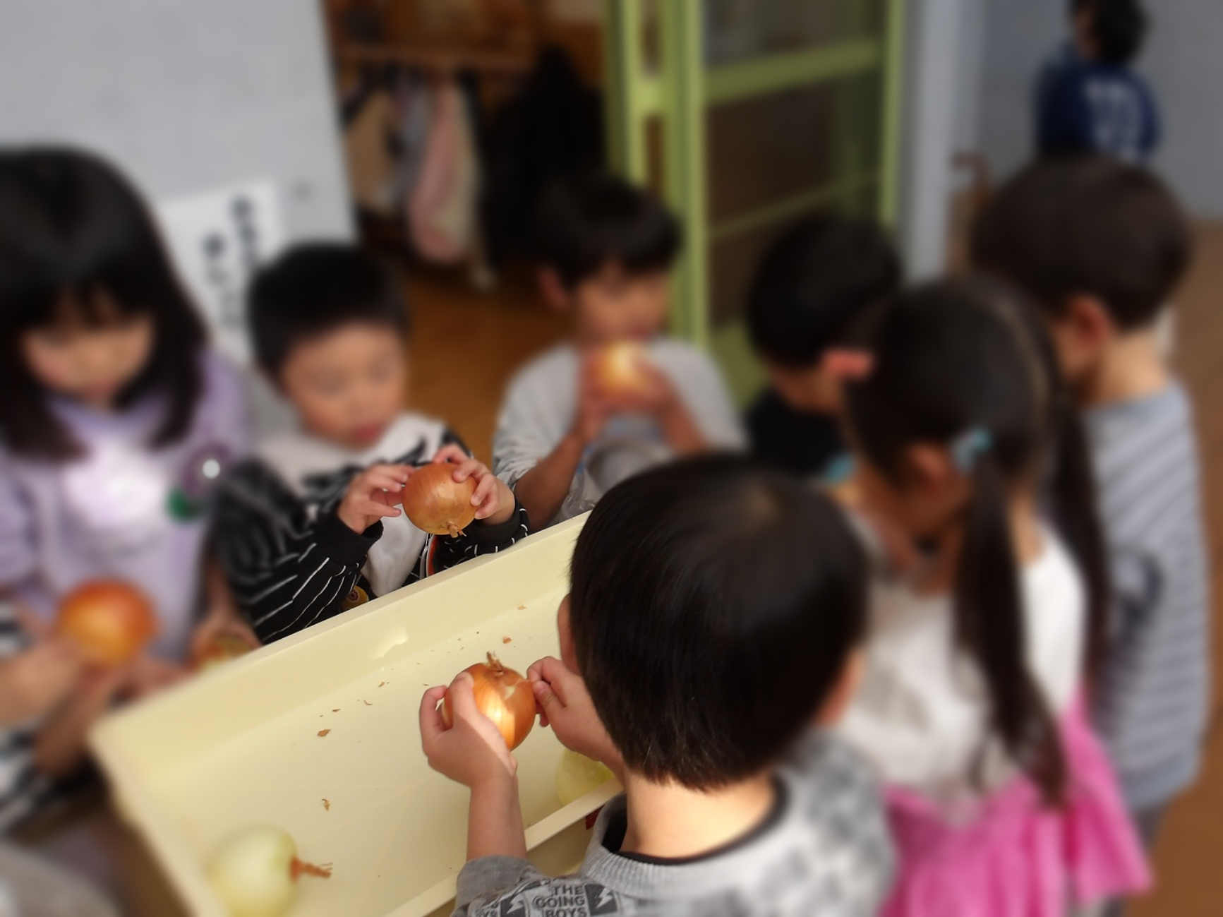明日は2月の誕生会。誕生会の前日に仕込むのは恒例の「たまねぎの皮むき」