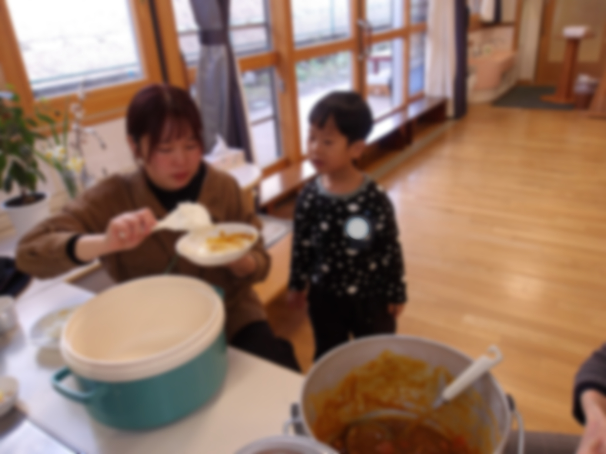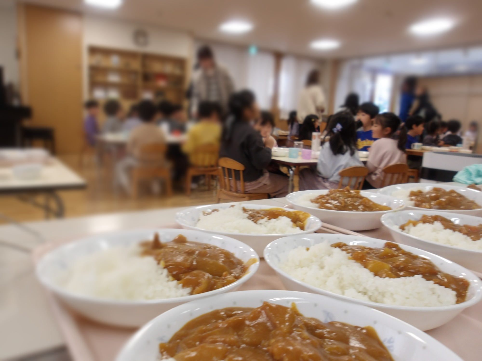 きょうは特別におかわりのできる日。年長さん、小学校に行ってもさふらんカレーの味を思い出してね!写真はおかわりの列の様子です