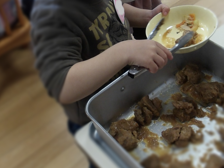 年少さんが盛り付けを始めて2週間。今日はおかずをトングでとりました。上からトングをもって肉を挟んでとれていますね。黄色の食器はアレルギー対応の子が一番最初に盛り付けます