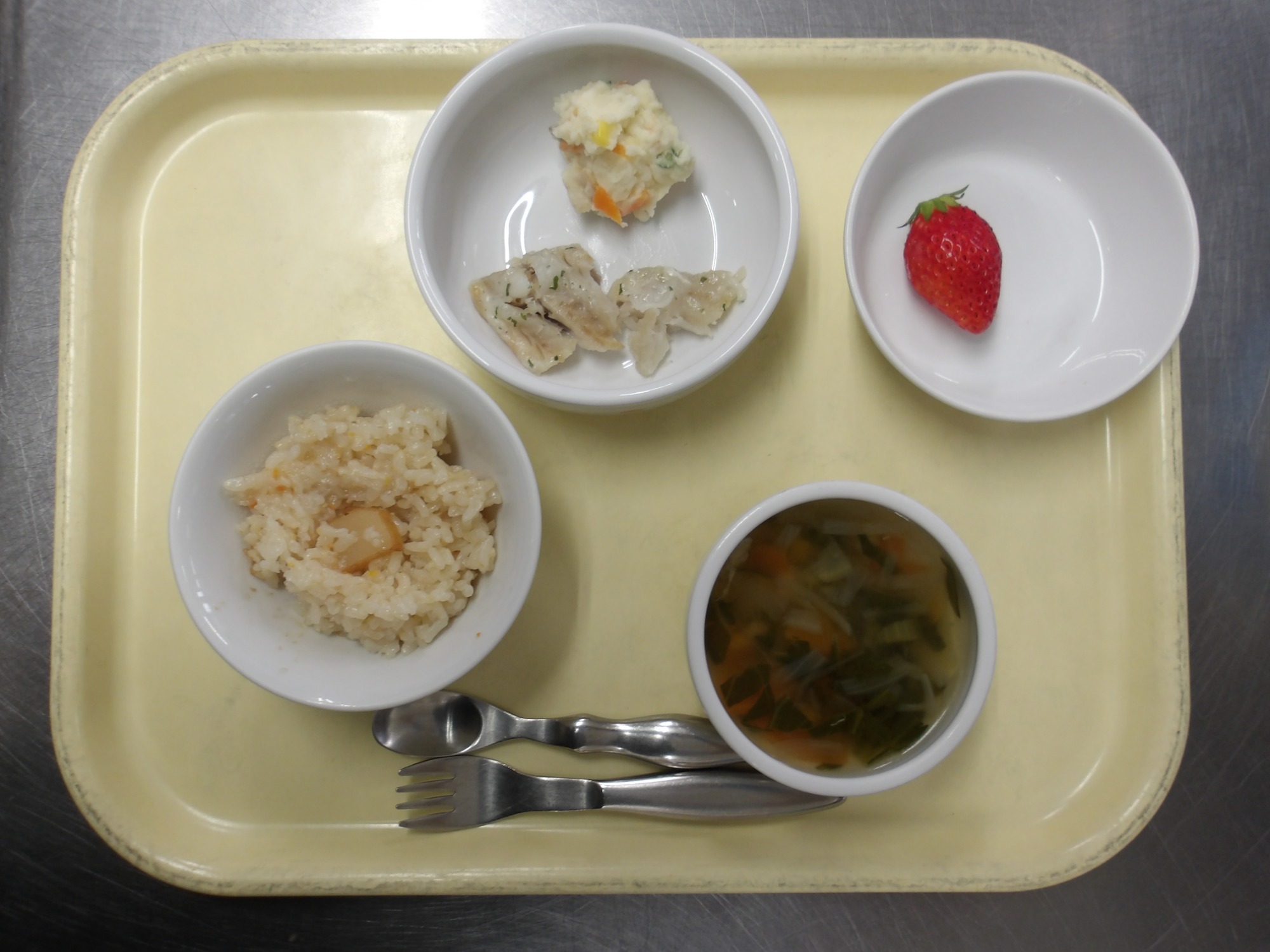 きょうはりんご組とさくらんぼ組のランチルーム給食♪具入りのご飯は減らしてくださいが多いのですが、減らした後に今日はよくおかわりしていた様子。もりもり食べたね!