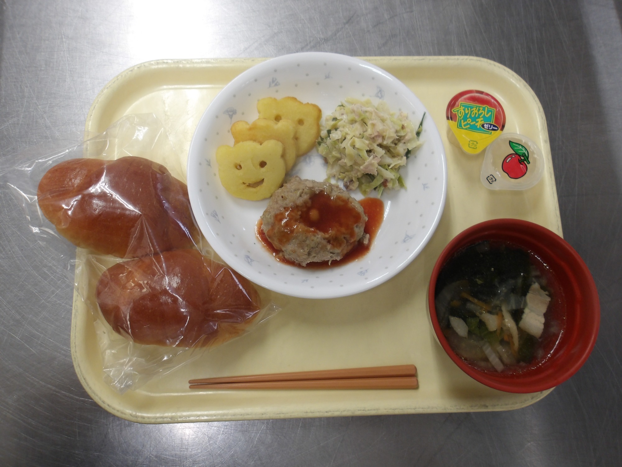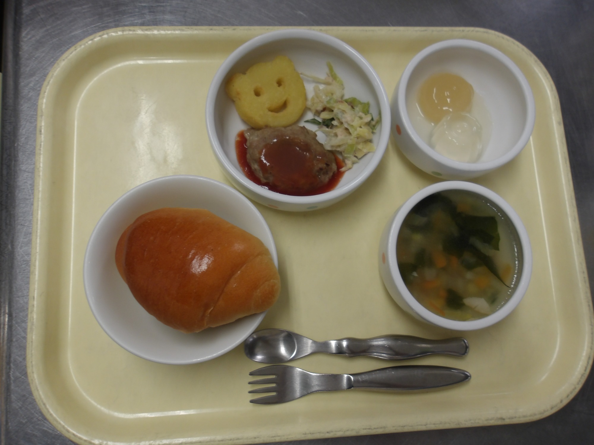 お店:バターロール ポテト りんごジュース ゼリー(リンゴ味もも味) 配膳:ハンバーグ きゃべつなサラダ はるさめスープ おやつ:ごまこんぶおにぎり