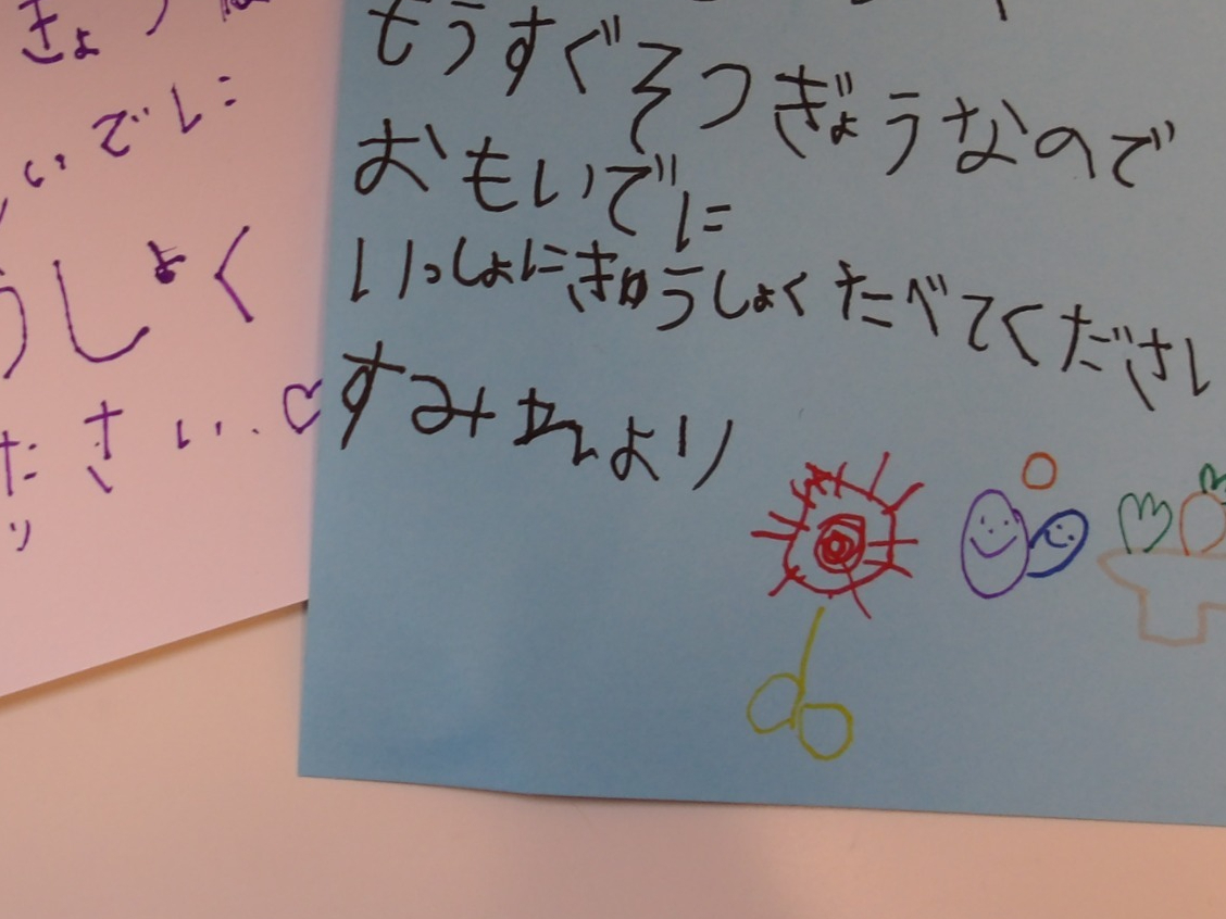 給食が終わった後、ゆり組さんの子たちが キッチンへ「空いている日にゆり組に給食を食べに来てください」とお手紙をいただきました♪一緒に食べられる日が楽しみです♪