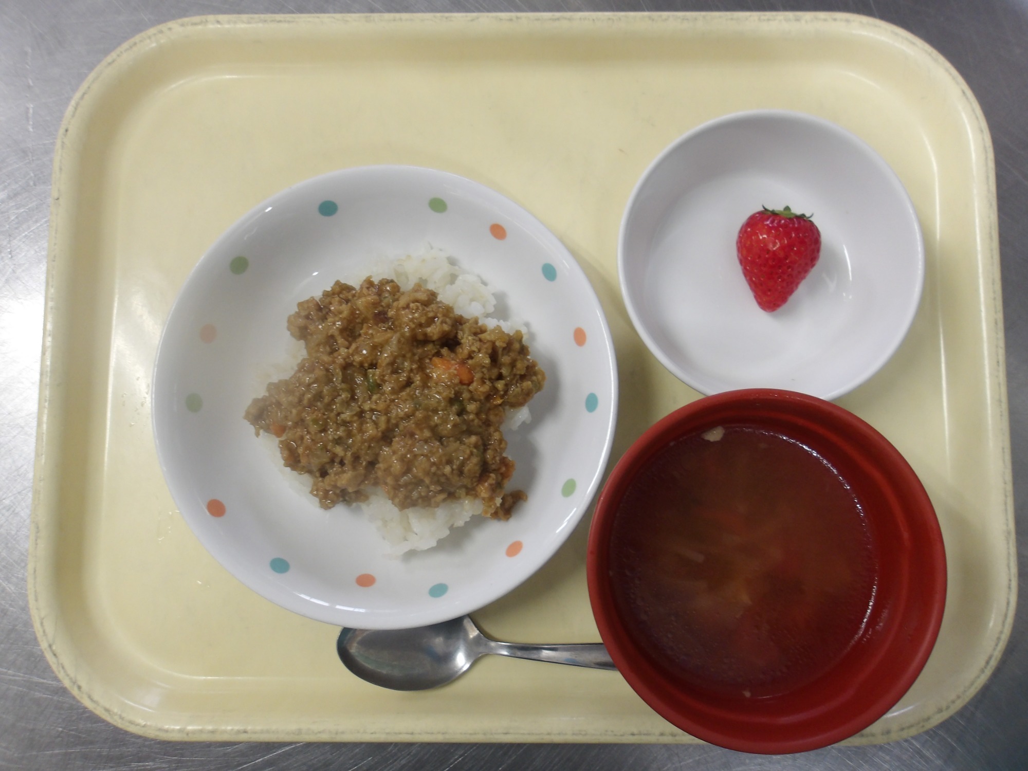 甘辛い味のマーボー豆腐。今日は高野豆腐も混ぜてカルシウム強化!しっかり食べたかな? こちらの盛り付けはうさぎ組です。