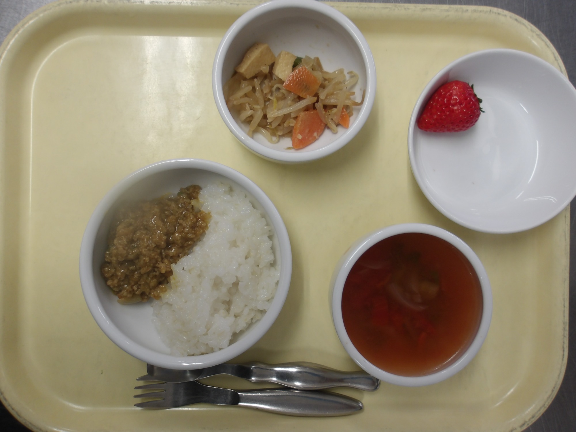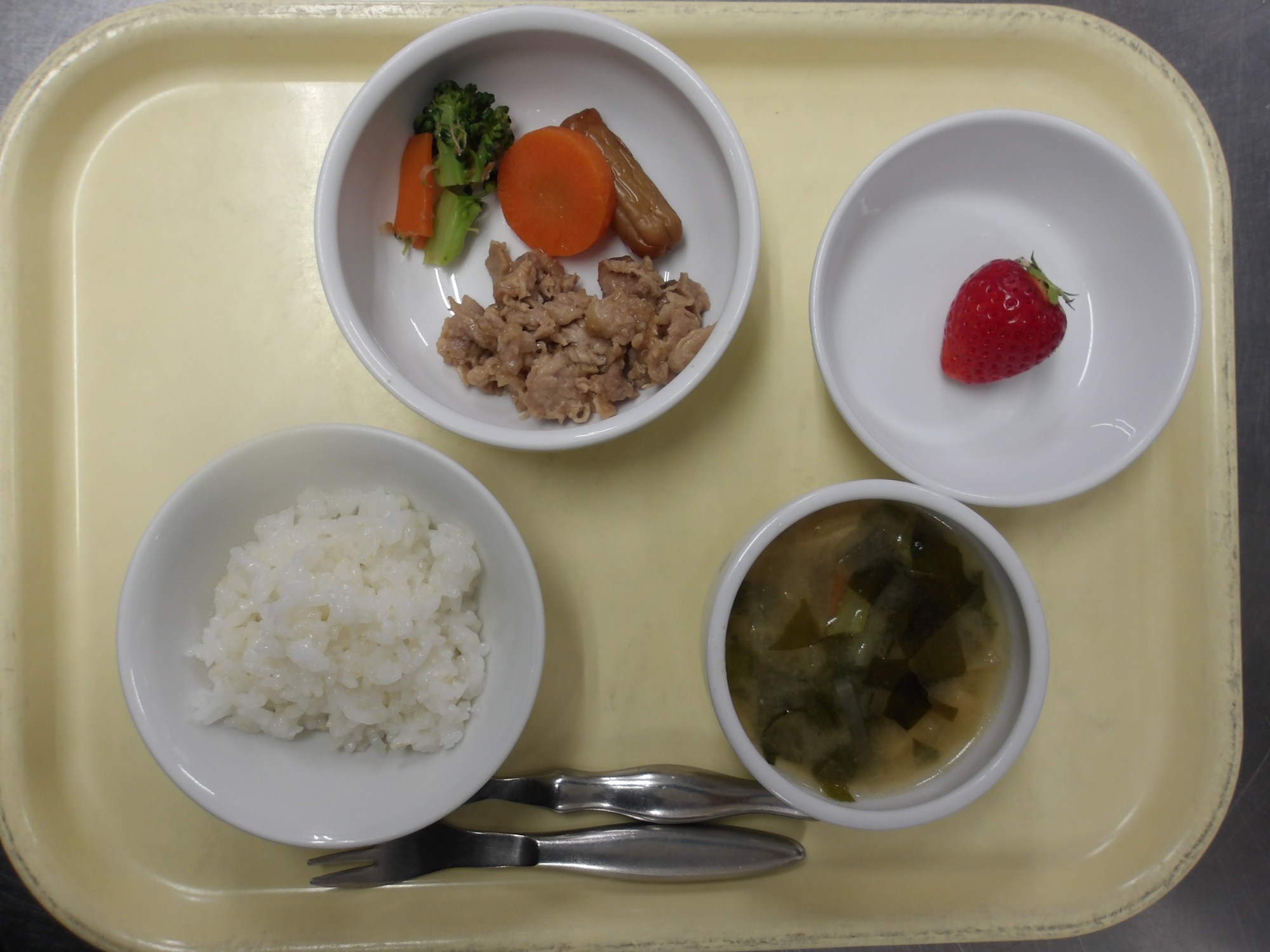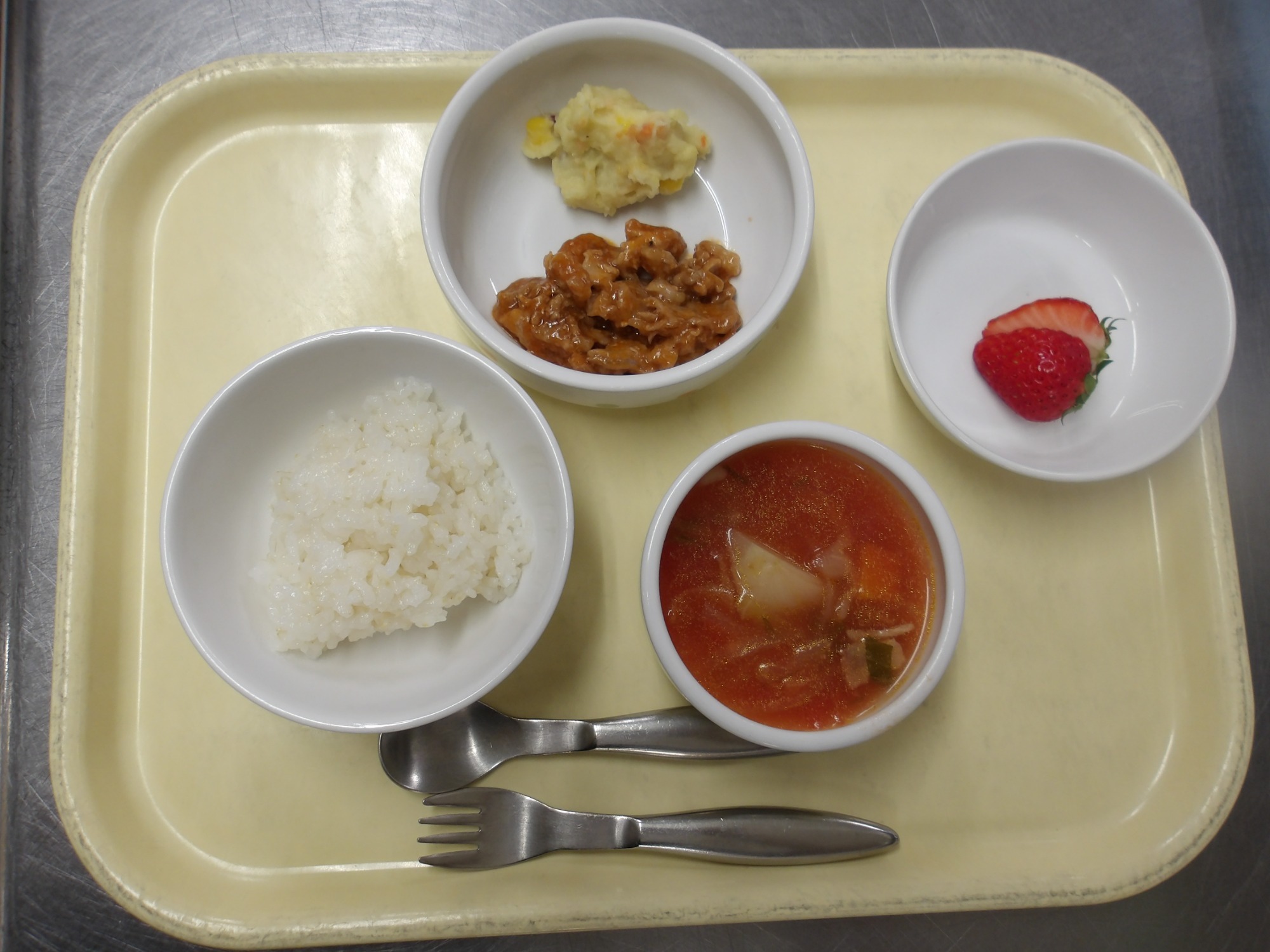 ごはん ポークチャップ スイートポテトサラダ ミネステローネスープ いちご おやつ:にんじんケーキ