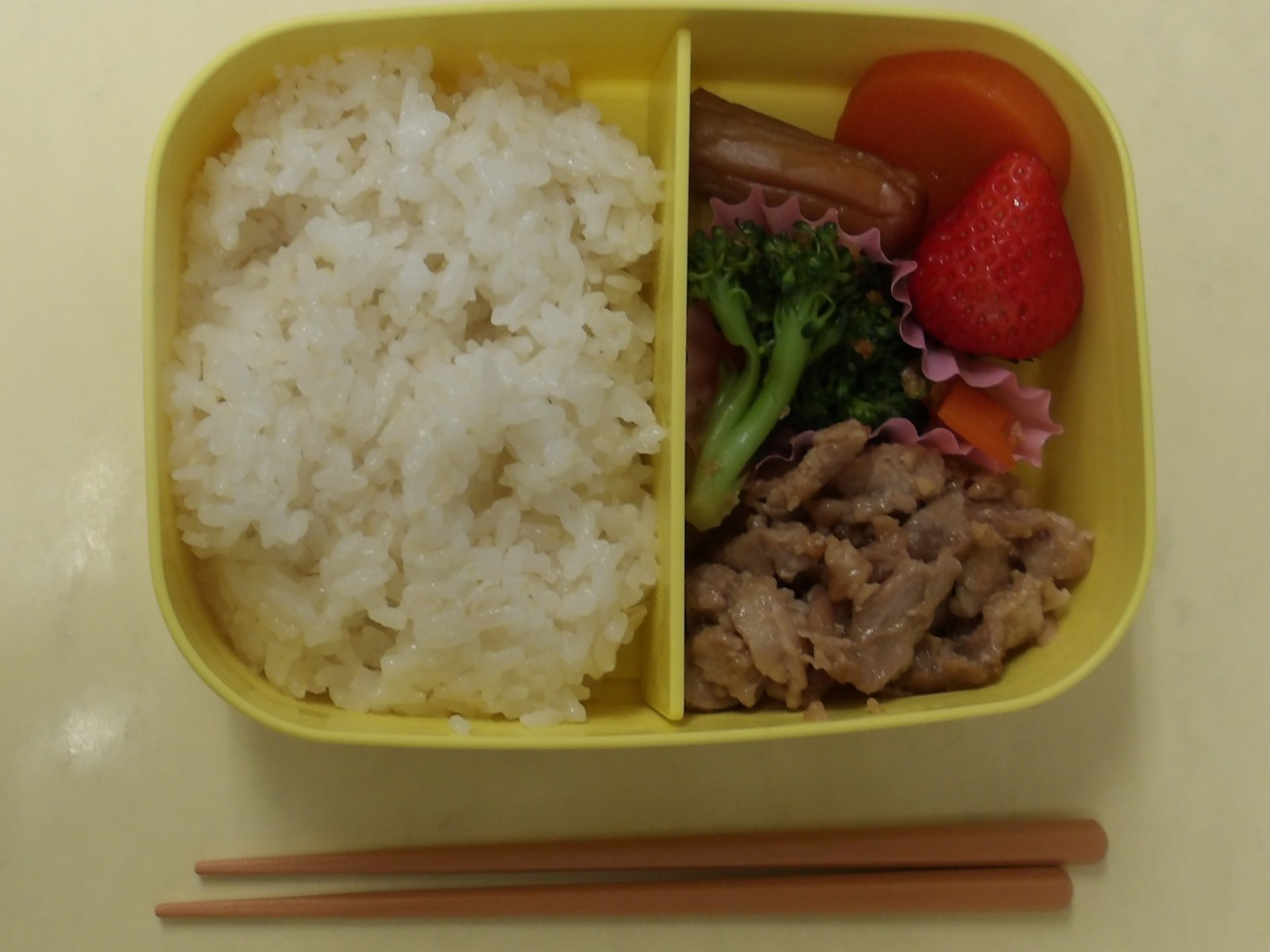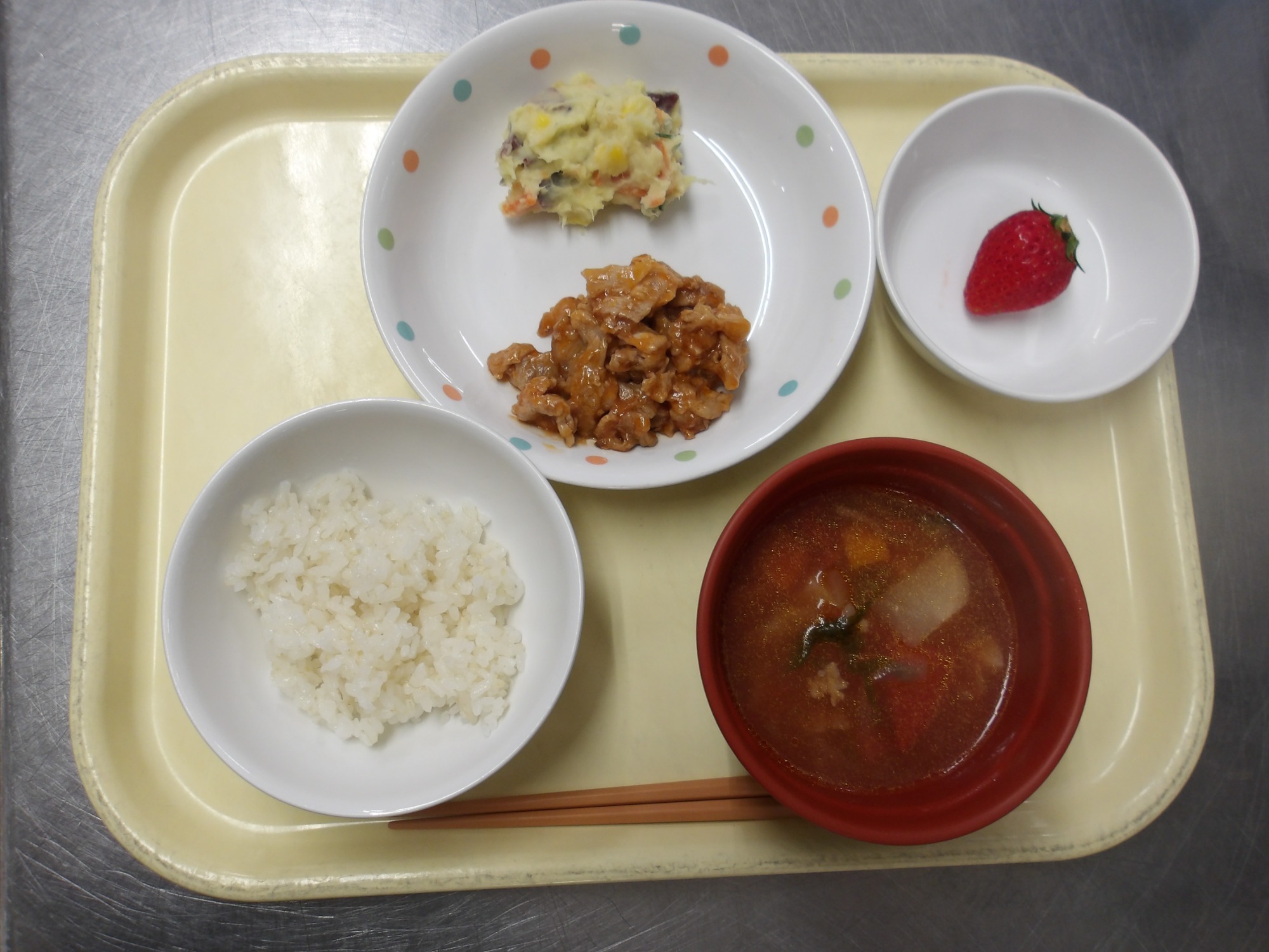 みんな大好きな豚の生姜焼き。うさぎ組の子たちもご飯と一緒に完食。一時預かりのお友達ももりもり食べていましたね♪