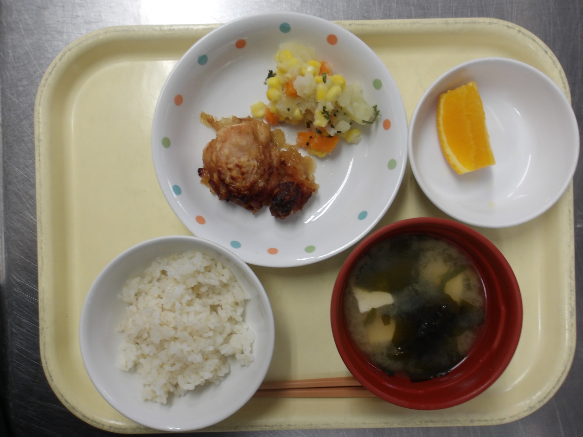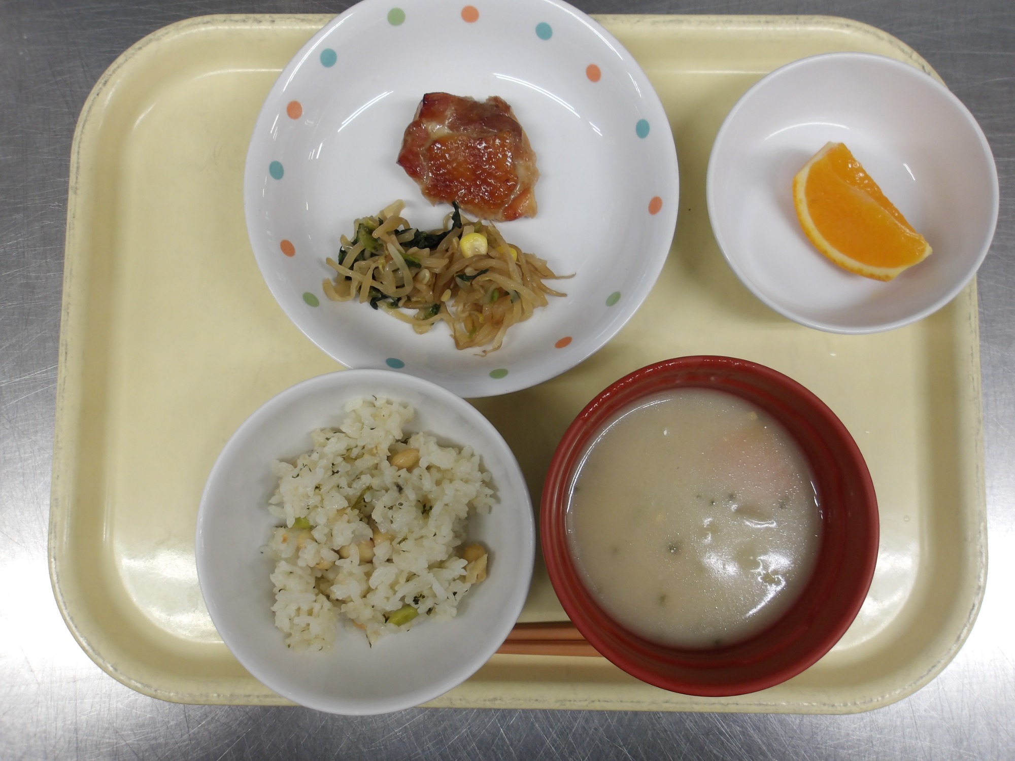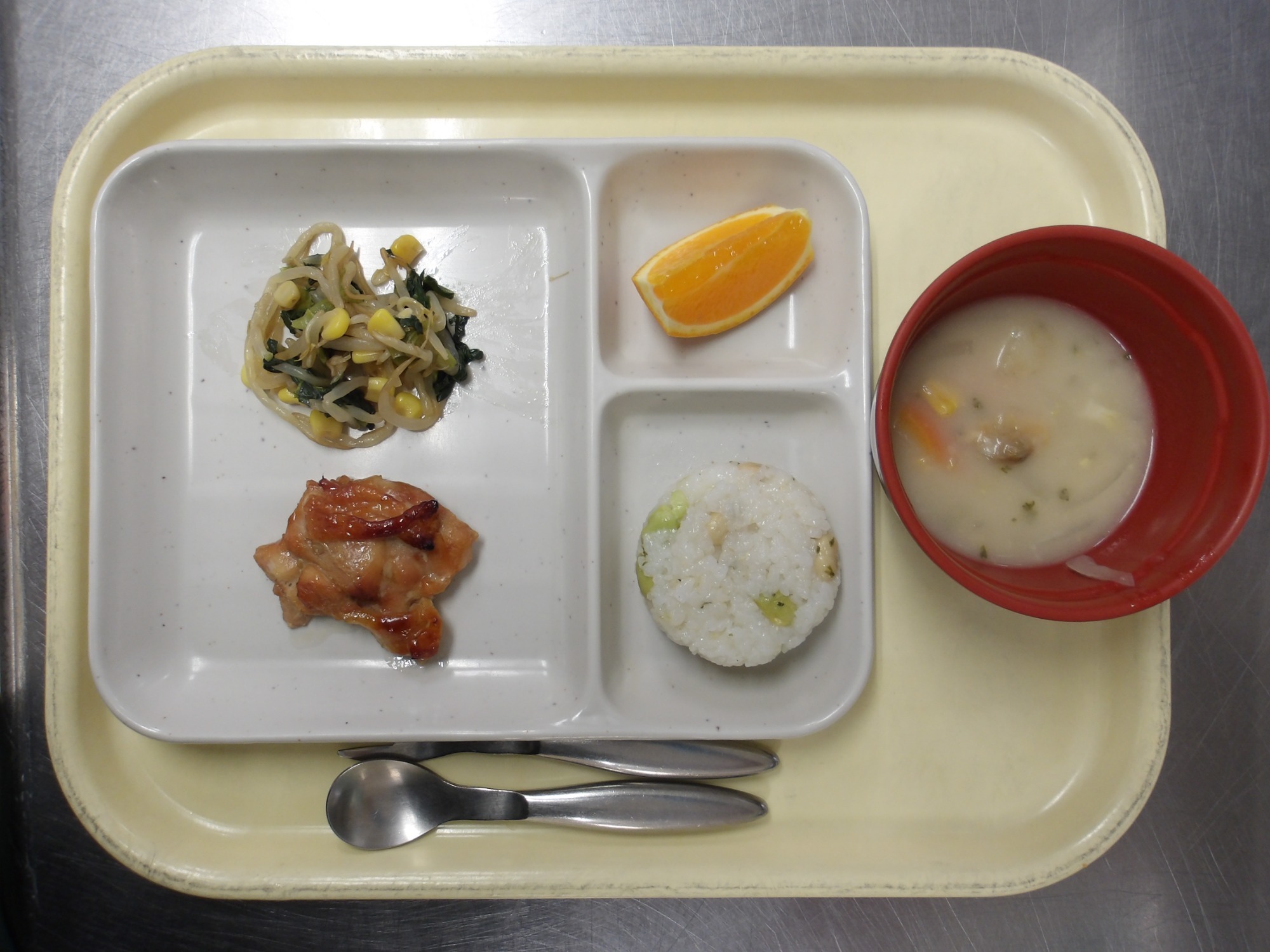 豆ピラフ 主菜 鶏の照り焼き 副菜 コーンもやし クラムチャウダー オレンジ おやつ:ごまゆかりおにぎり