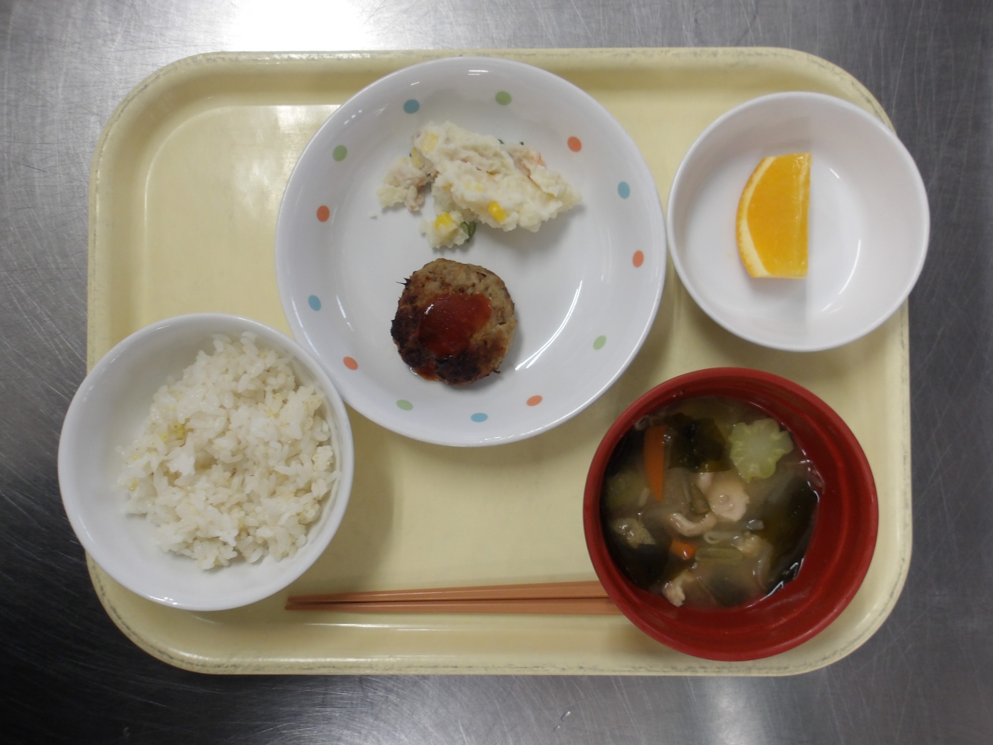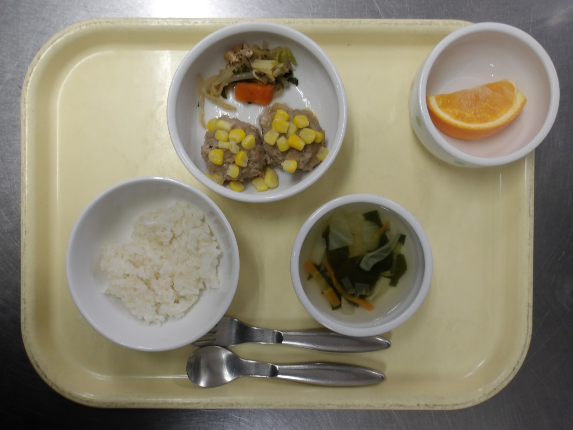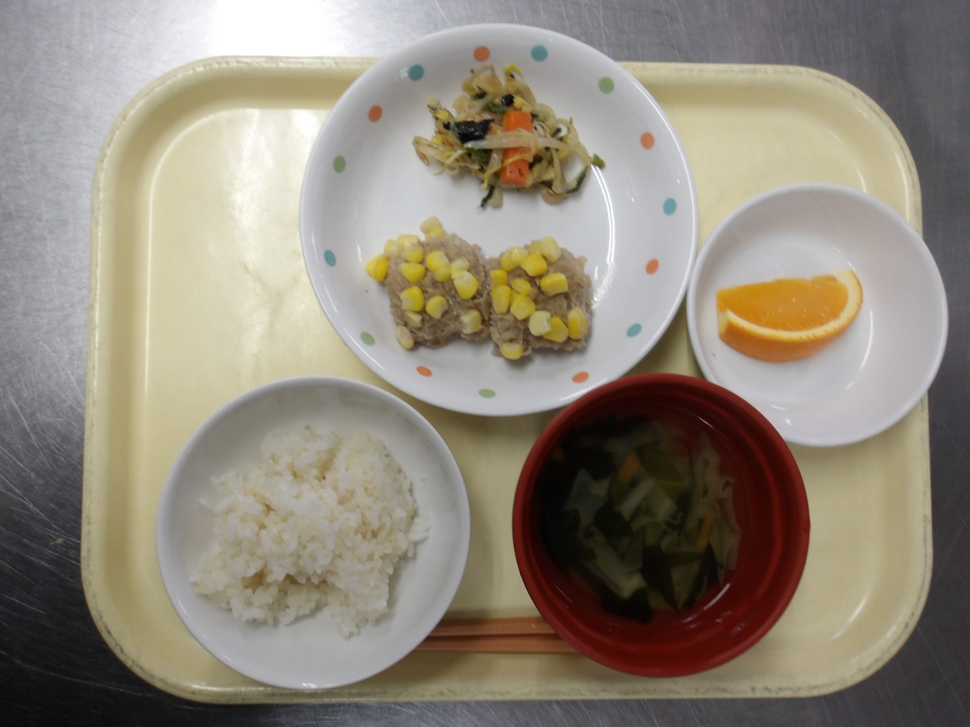 豆ピラフ 主菜 鶏の照り焼き 副菜 コーンもやし クラムチャウダー オレンジ おやつ:ごまゆかりおにぎり