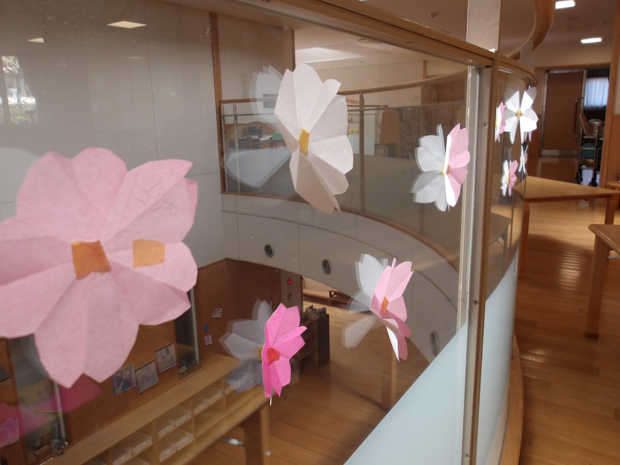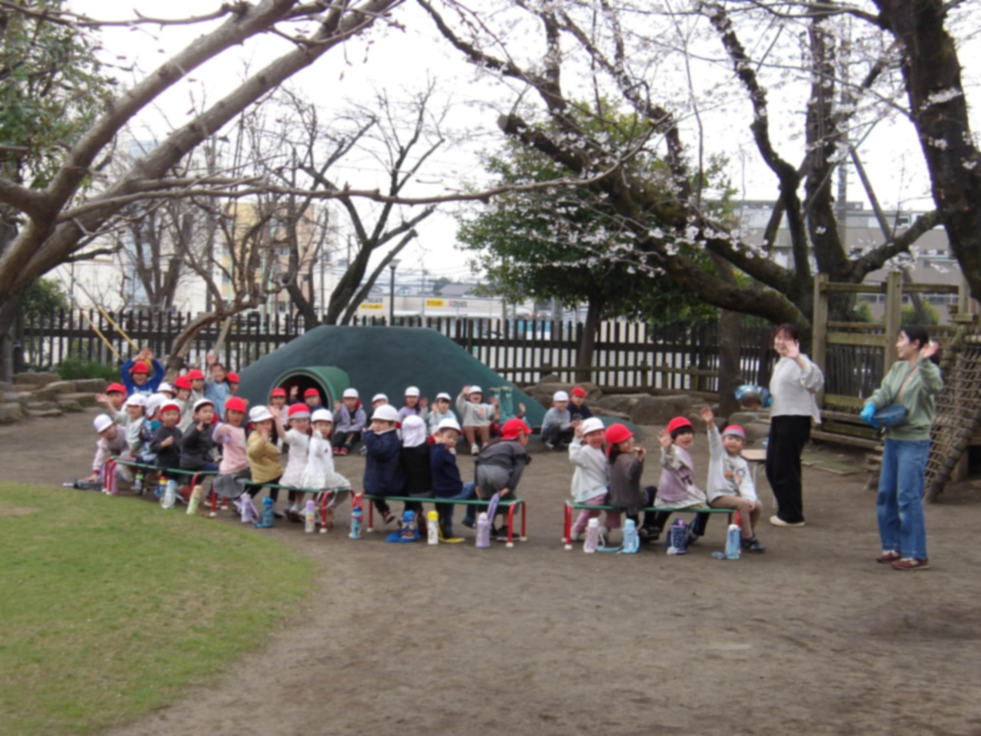 年中、年長のひだまりさんはお花見しながら おやつです♪みんなでいっしょのおやつは楽しいね!