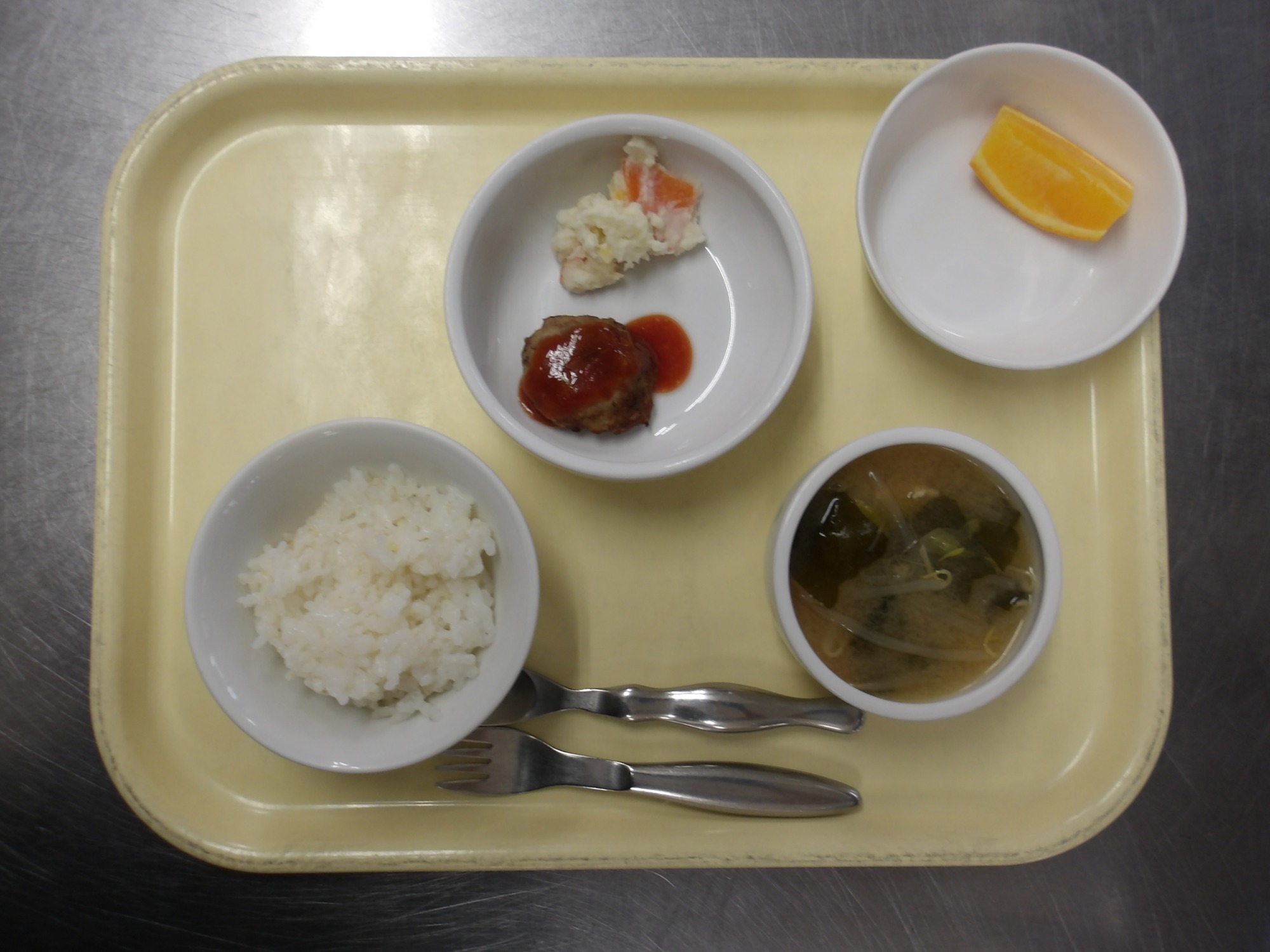 ごはん 鶏の竜田焼 カラフル粉ふき芋 豆腐のみそ汁 オレンジ おやつ:豆腐ココアドーナツ