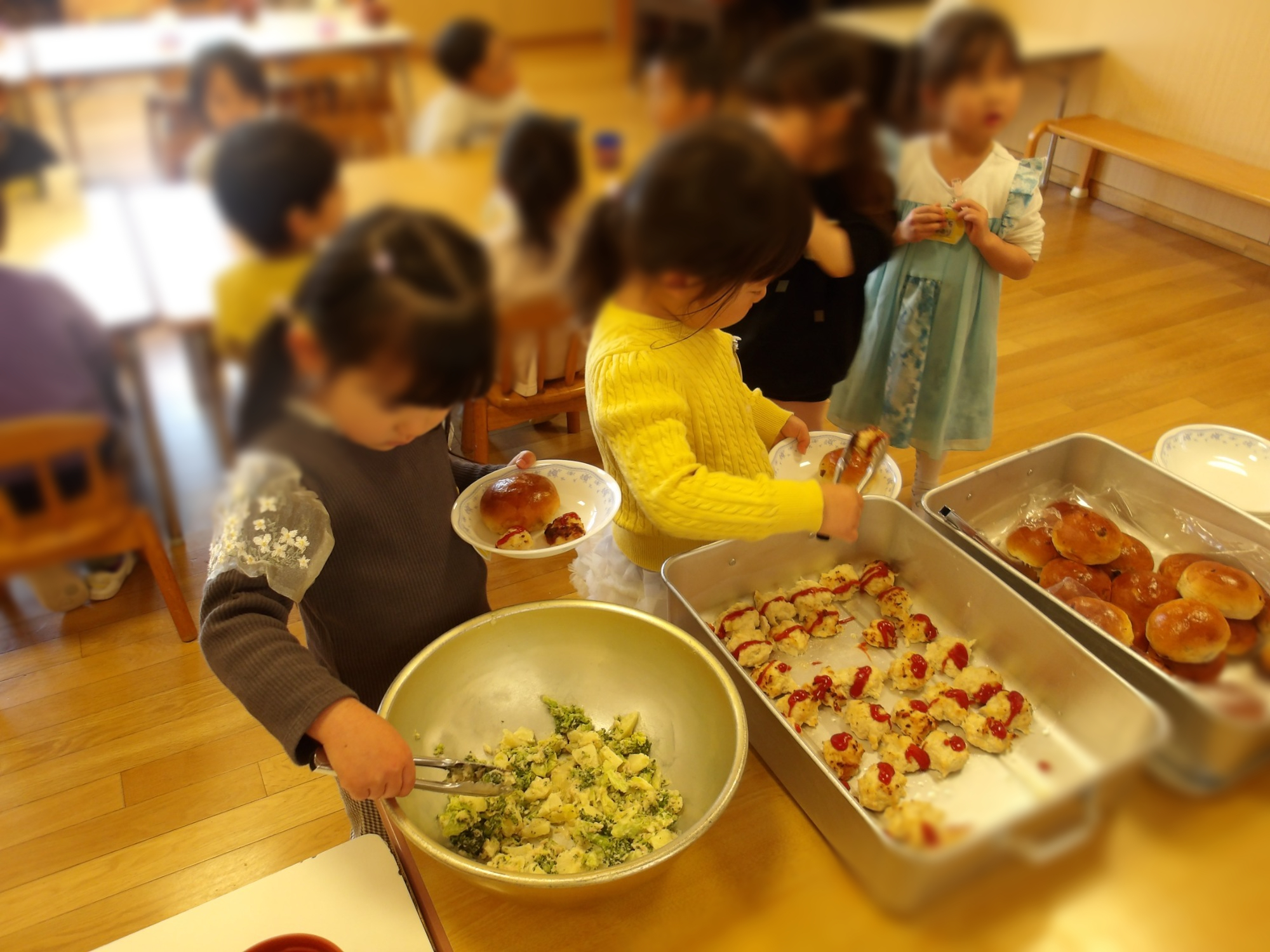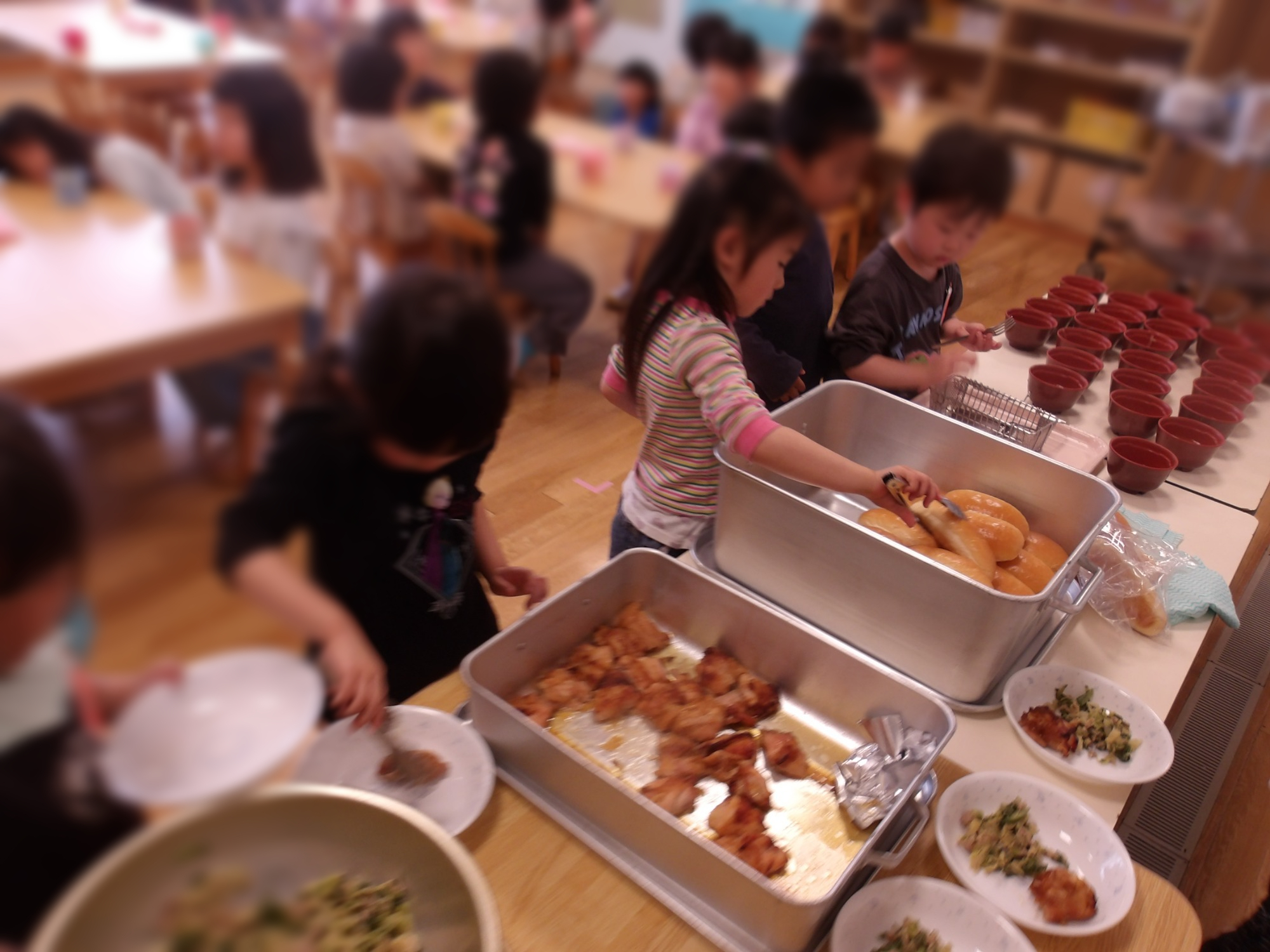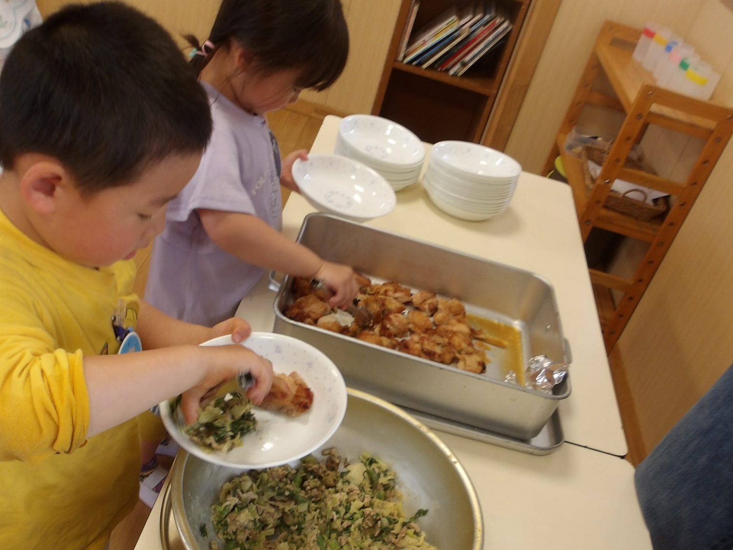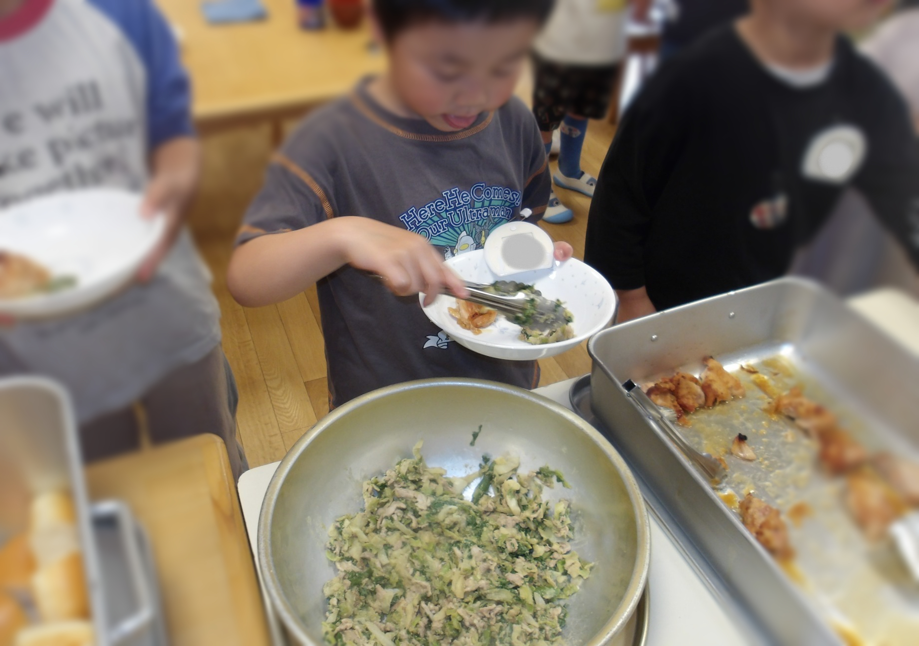 年長・年中は自分んで盛り付けます。見に行くたびに思うのは、しゃもじやトングの使い方がどんどんうまくなっていくのが頼もしいです♪