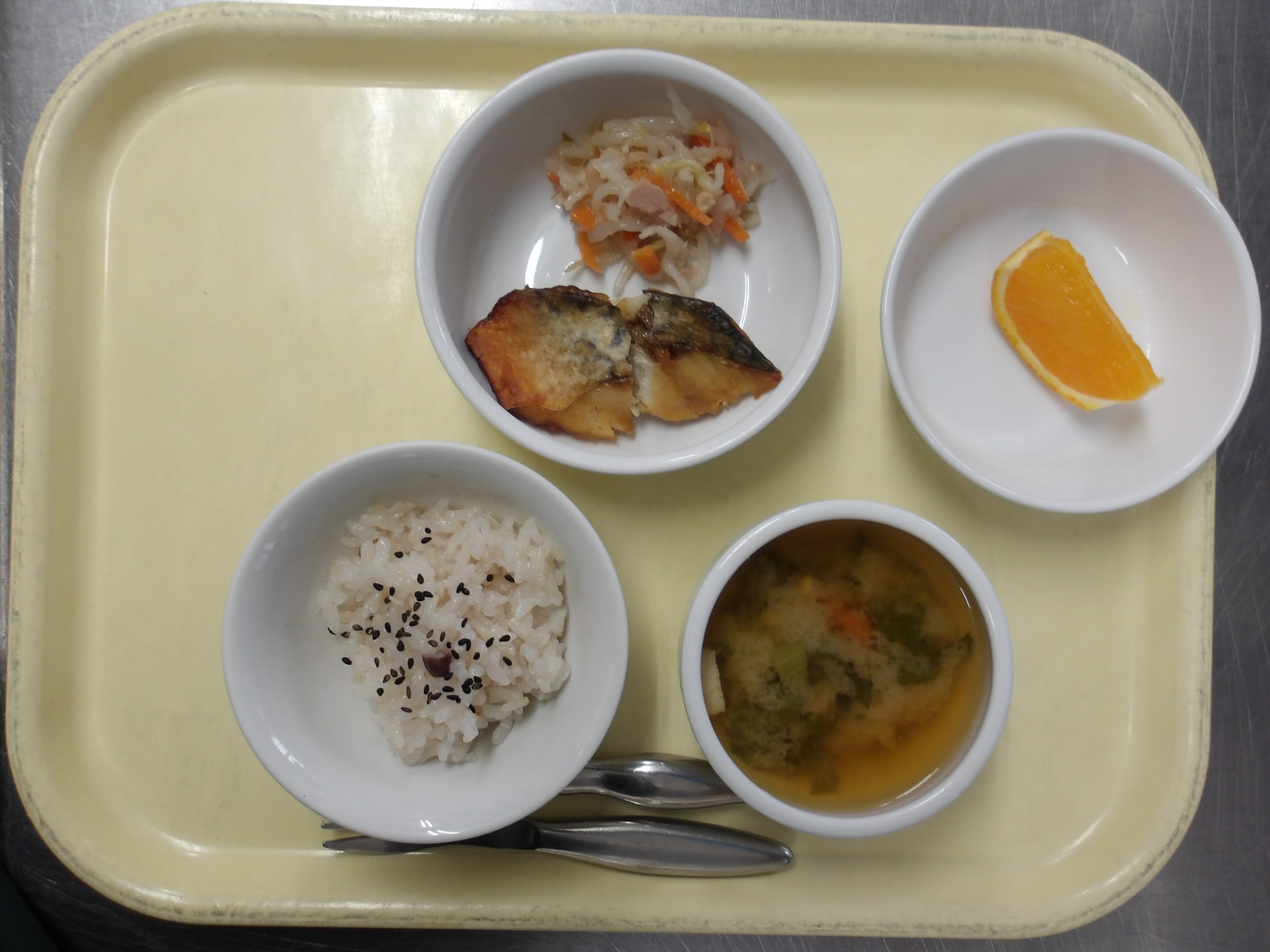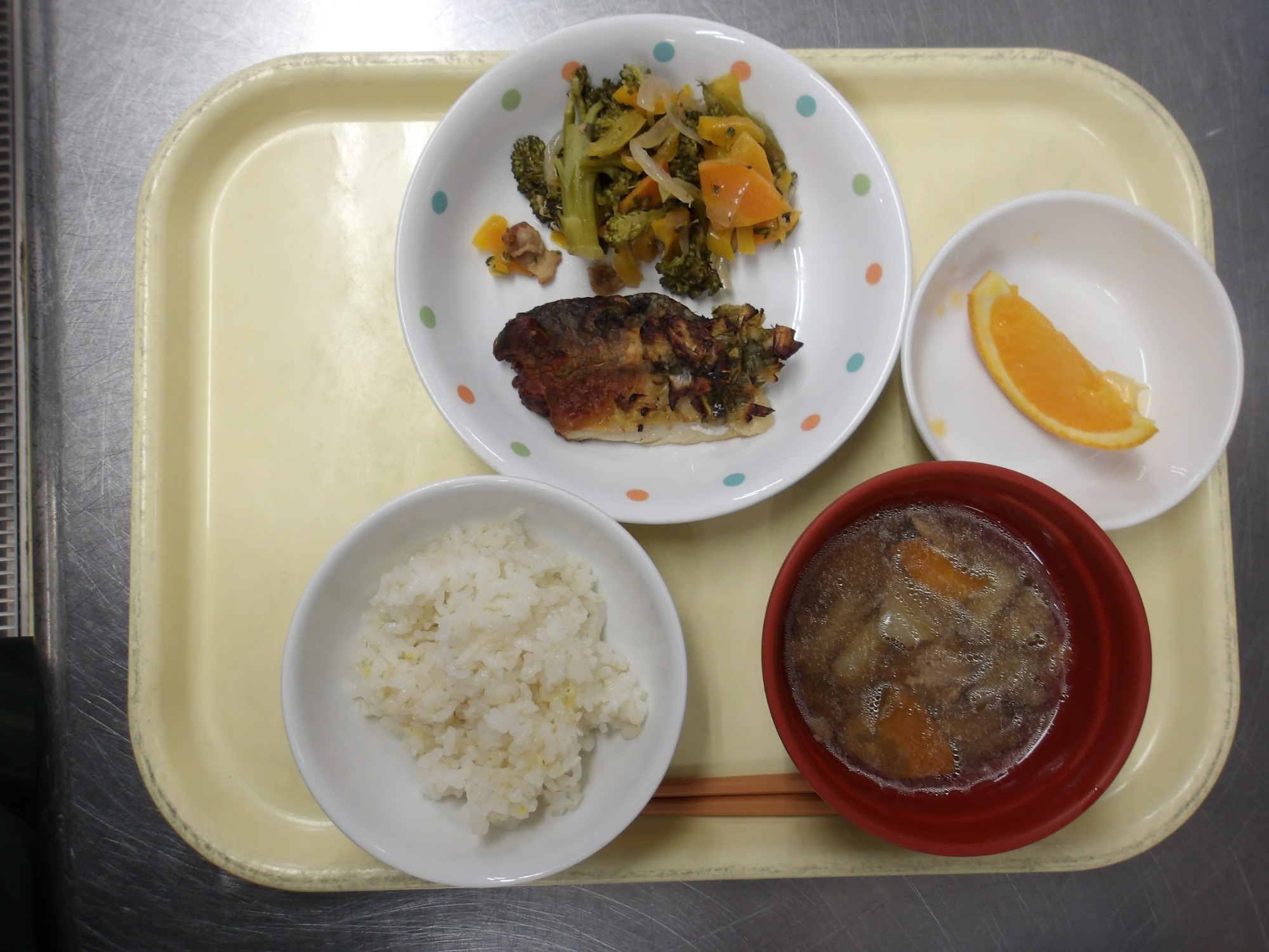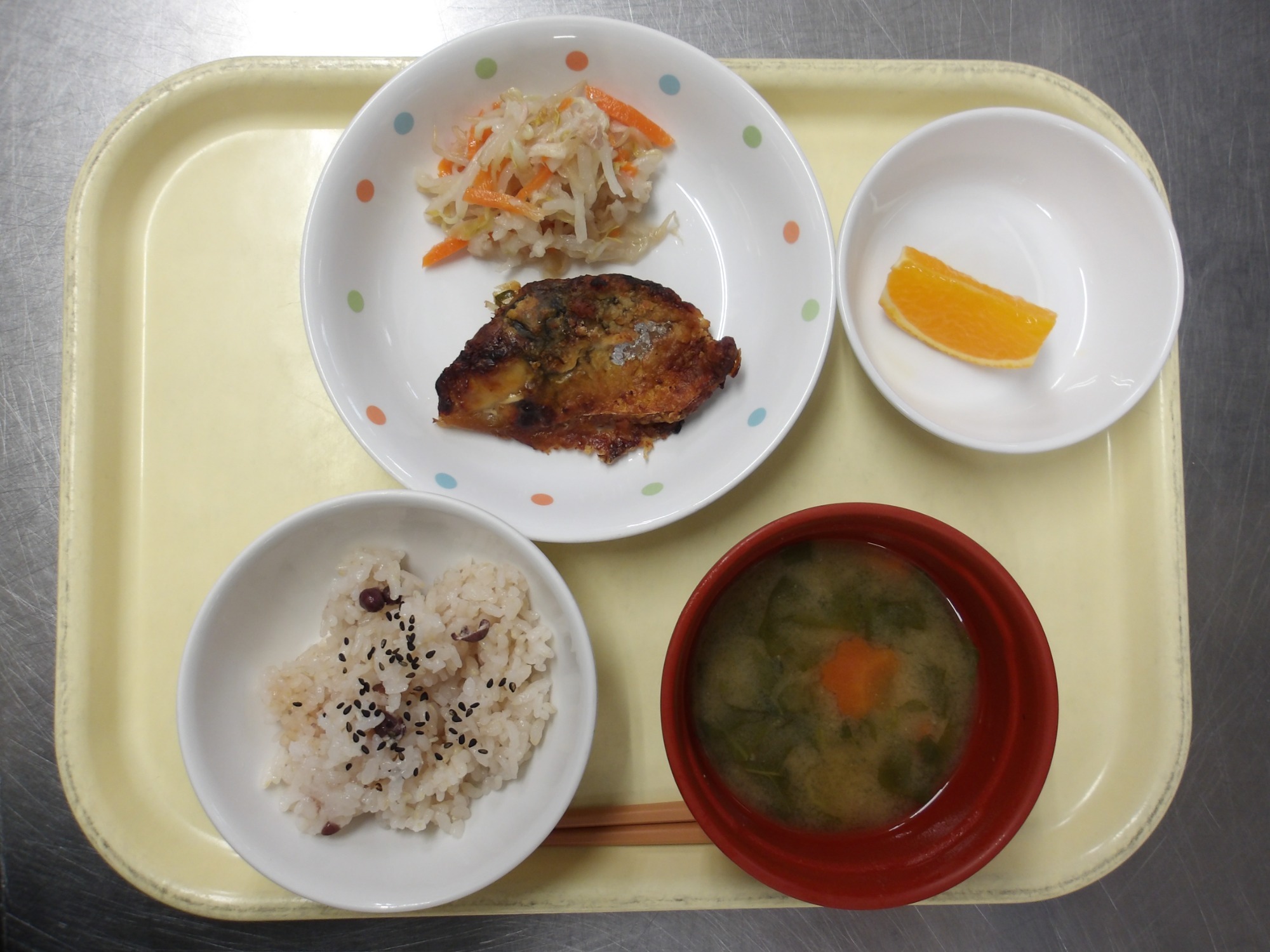 きびごはん 鯖の竜田焼 吉野汁 オレンジ 上川さんちのブロッコリーのビネガー炒め おやつ:ツナサンド(うさぎ:ジャムサンド)