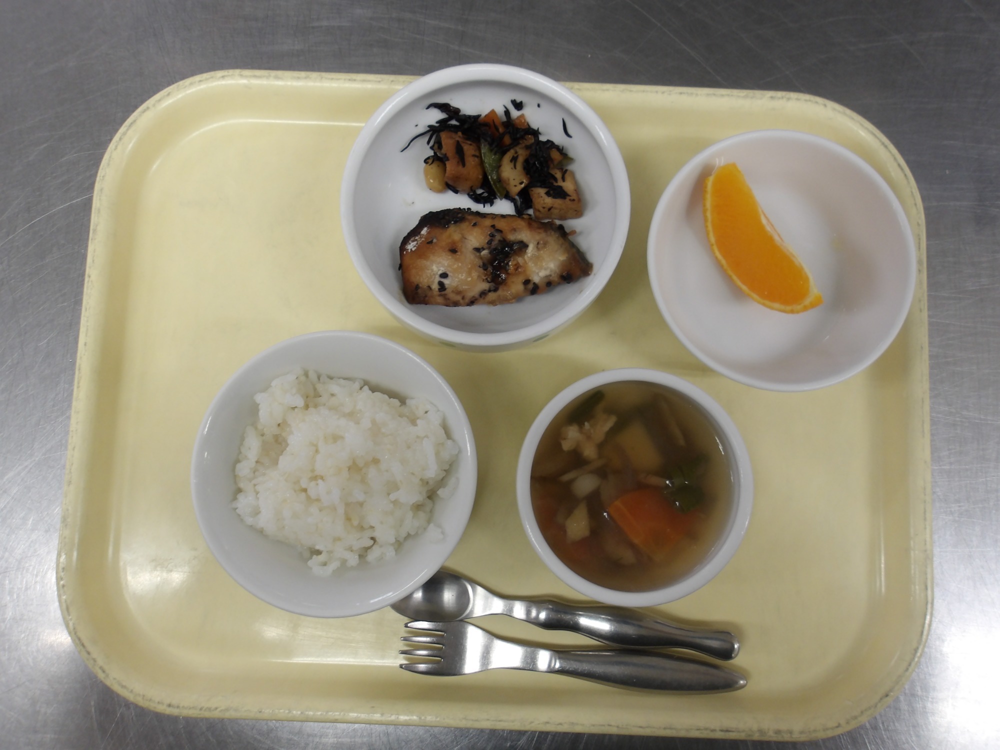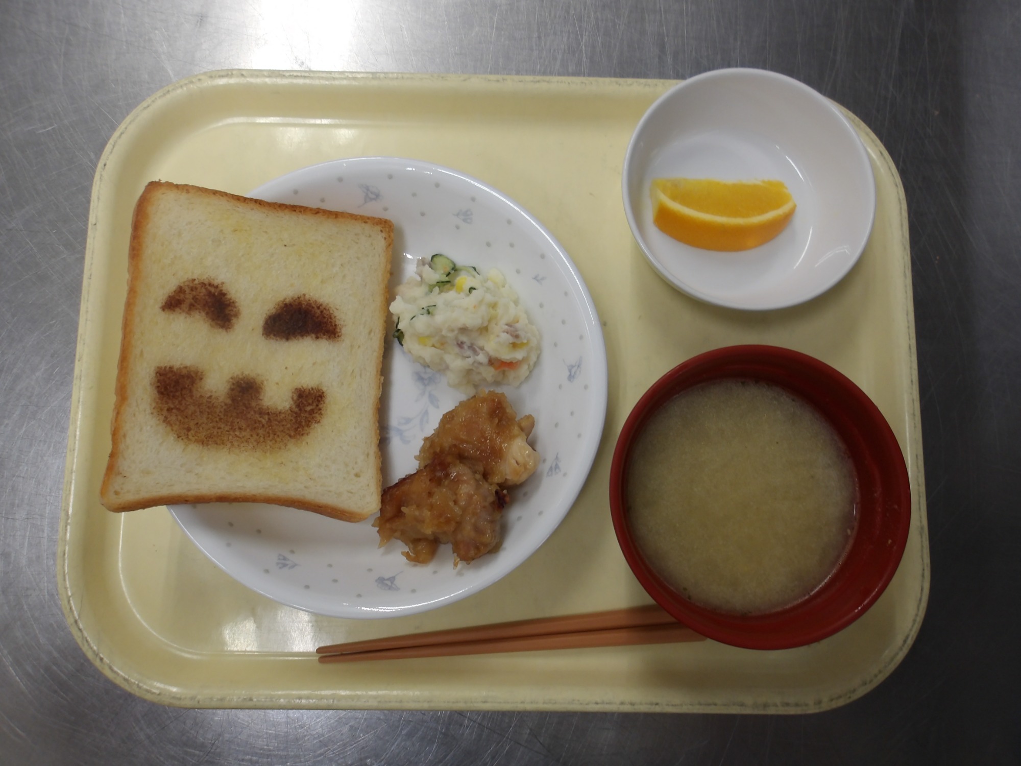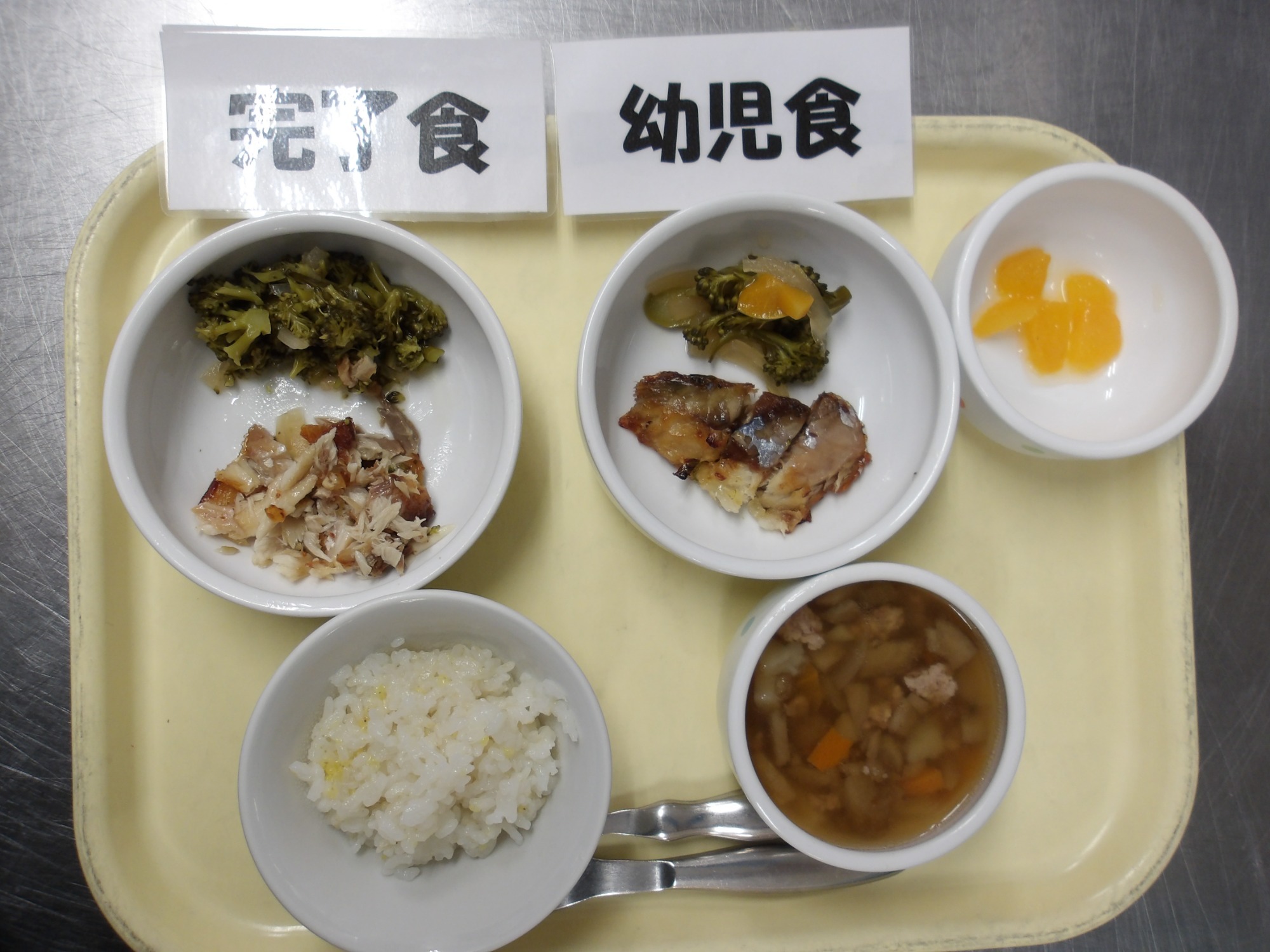 きびごはん 鯖の竜田焼 吉野汁 オレンジ 上川さんちのブロッコリーのビネガー炒め おやつ:ツナサンド(うさぎ:ジャムサンド)
