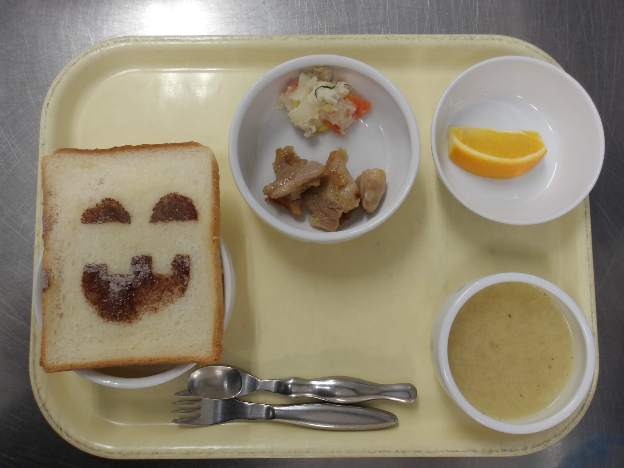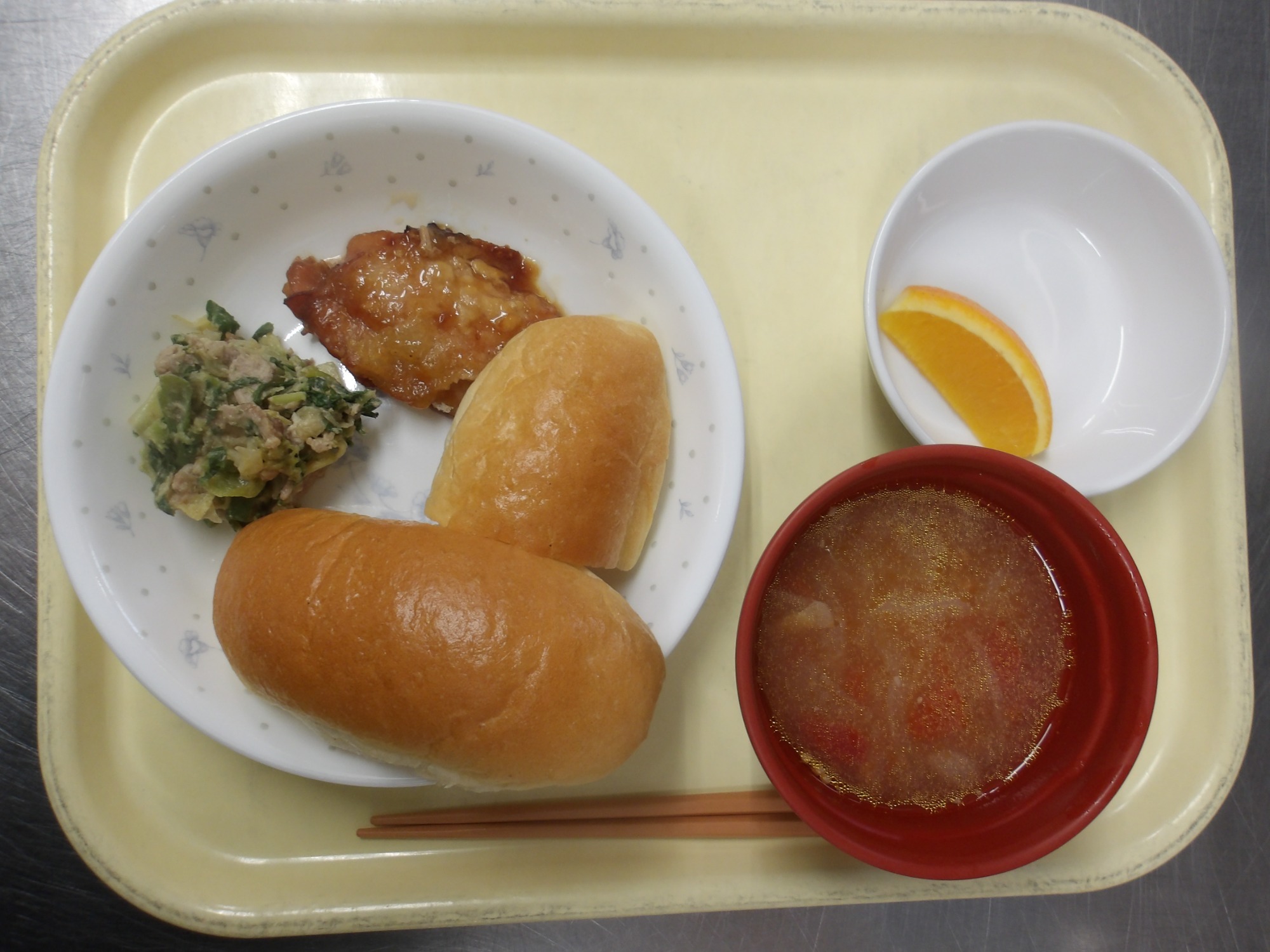 コッペパン 鶏の甘辛焼き 豚と青梗菜の練りごまあえ 大豆トマトスープ オレンジ