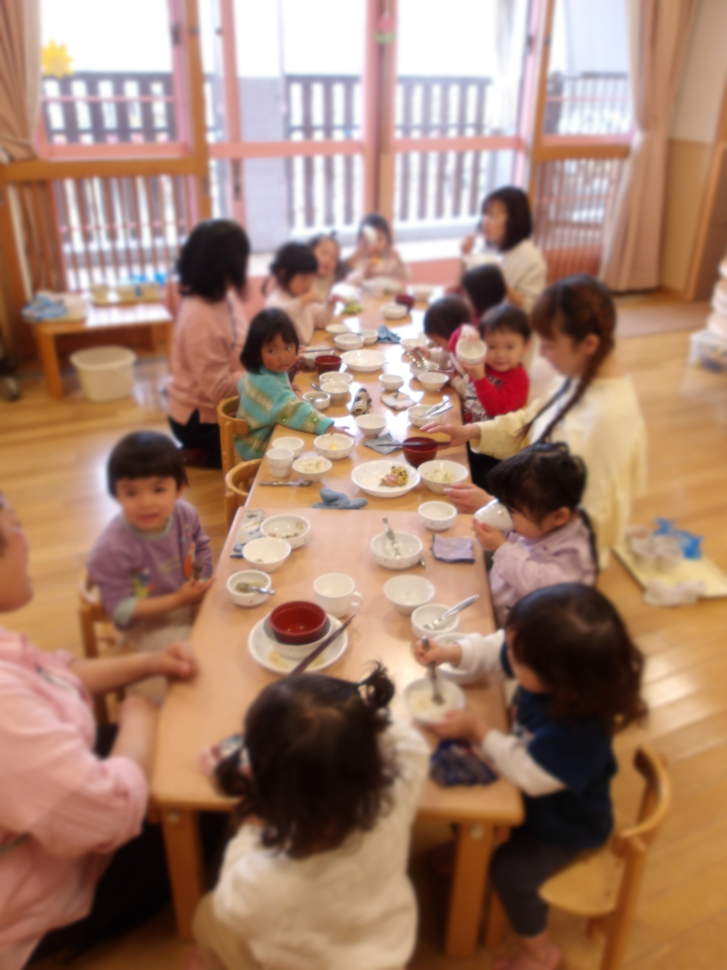 大きくなったねの会の今日は、りんご組さんはワンプレートランチ♪ うさぎ組のリクエスト給食の照り焼きやりんご組の大好きなスープでお祝いです!4月からも楽しみだね!