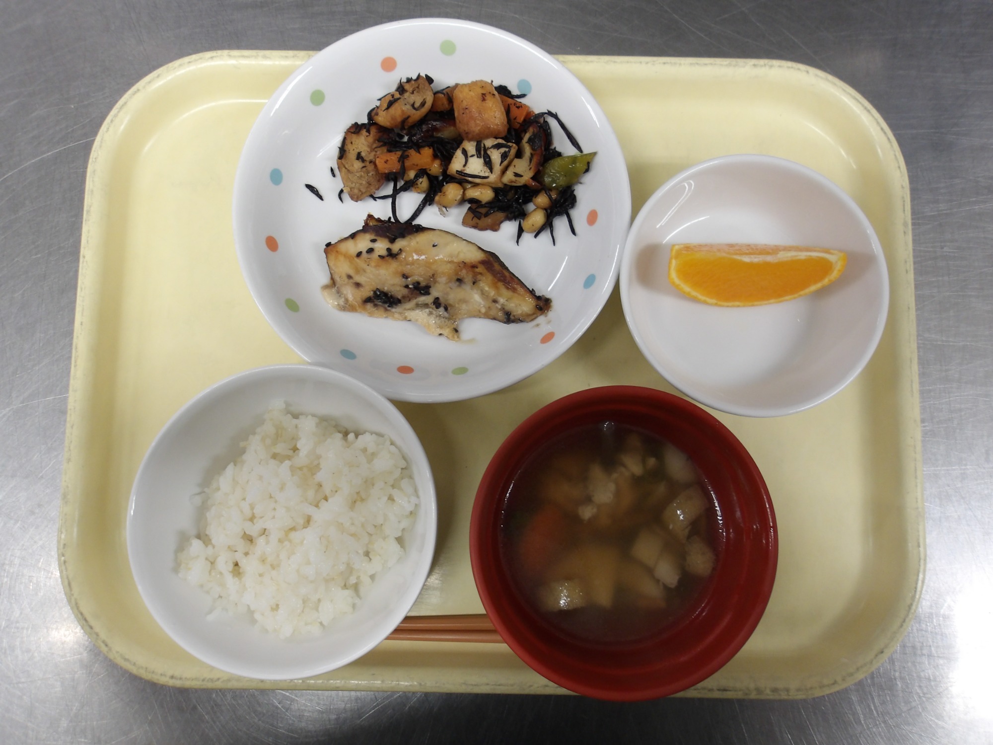 ごはん あじの利休焼き ひじきの炒り煮 のっぺい汁 でこぽん おやつ:ごまおからケーキ