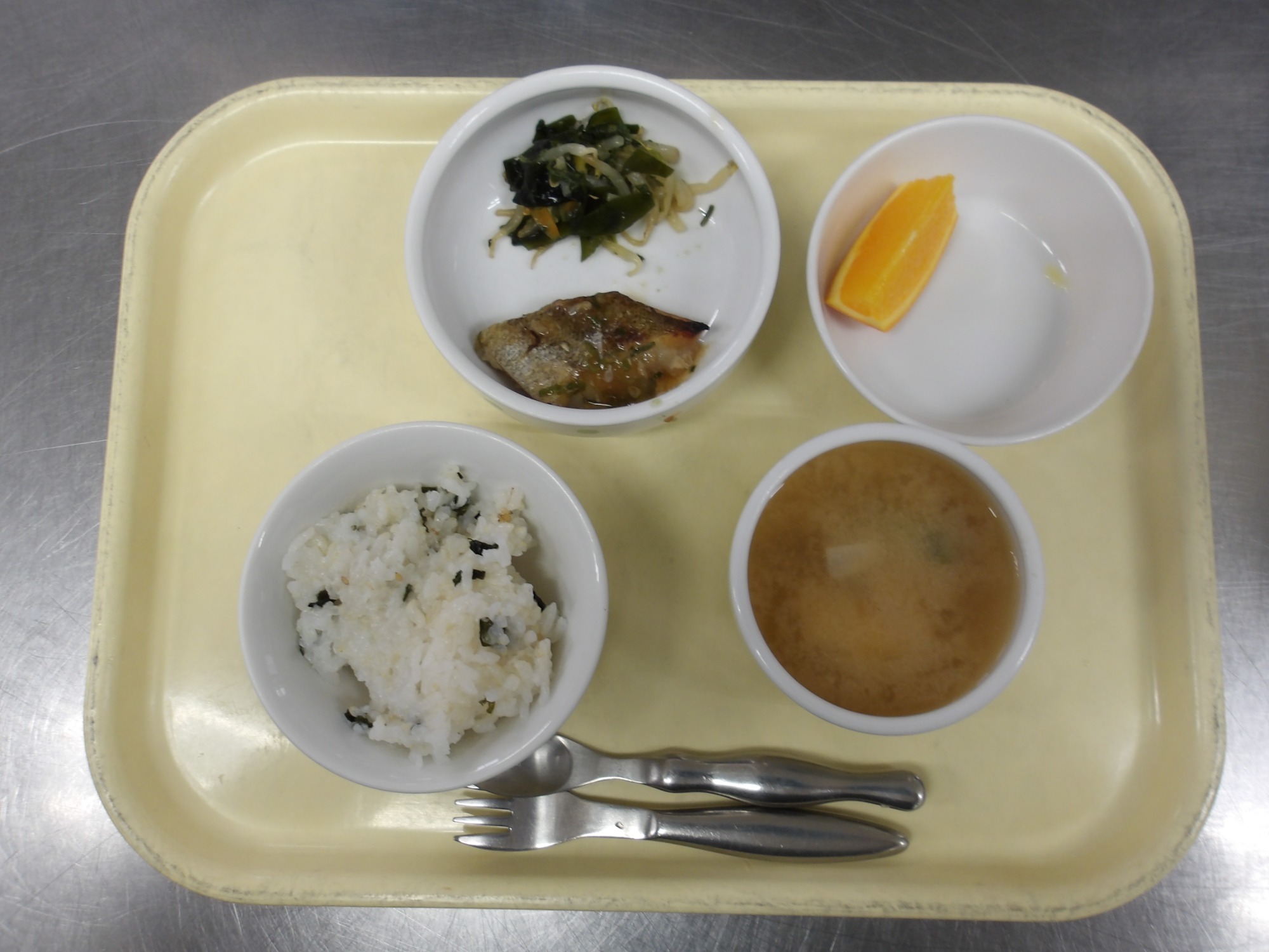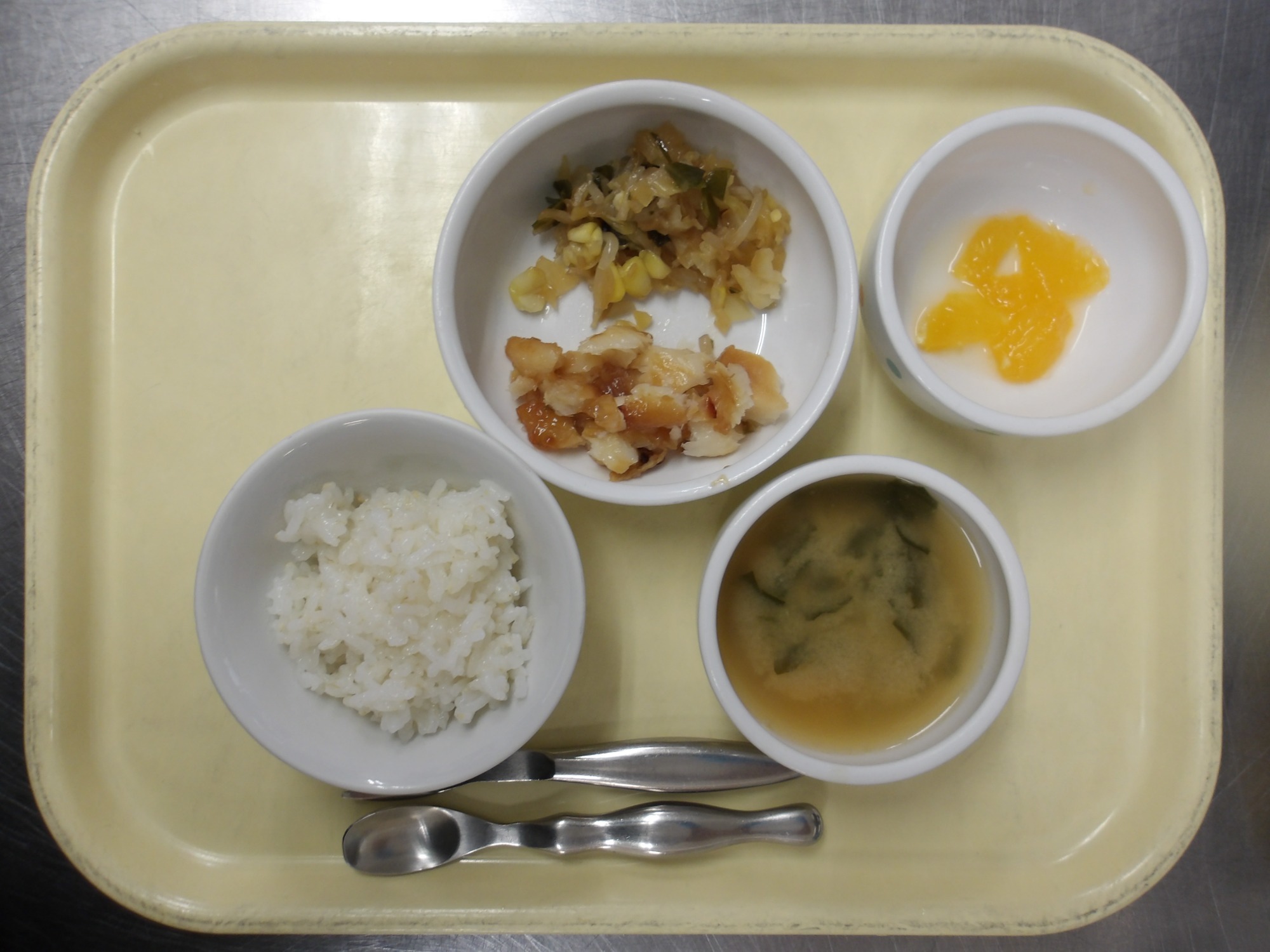 わかめごはん 鱈のスタミナ焼き 上川さんの畑の小松菜で中華和え みそ汁 オレンジ おやつ:かぼちゃケーキ
