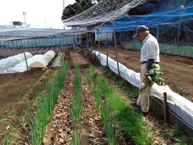 上川さんの畑へ行ってきました! じゃがいもが小さな芽を出していたり、4月になったら納品される予定の葉物もたくさん! (写真は九条ネギのところです)