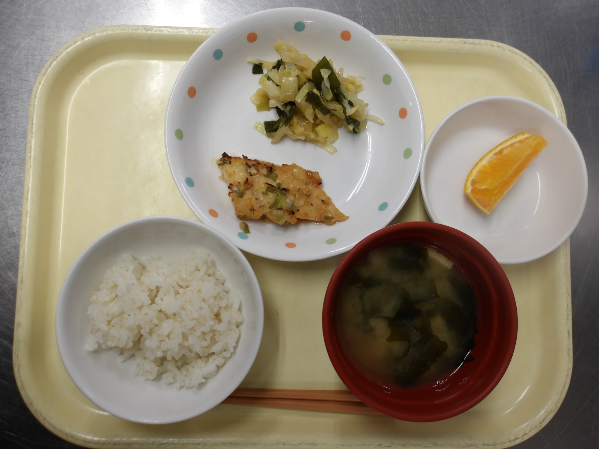 ごはん 菜の花しゅうまい 白菜のり和え 春のわかめスープ きよみオレンジ おやつ:さつまいもケーキ