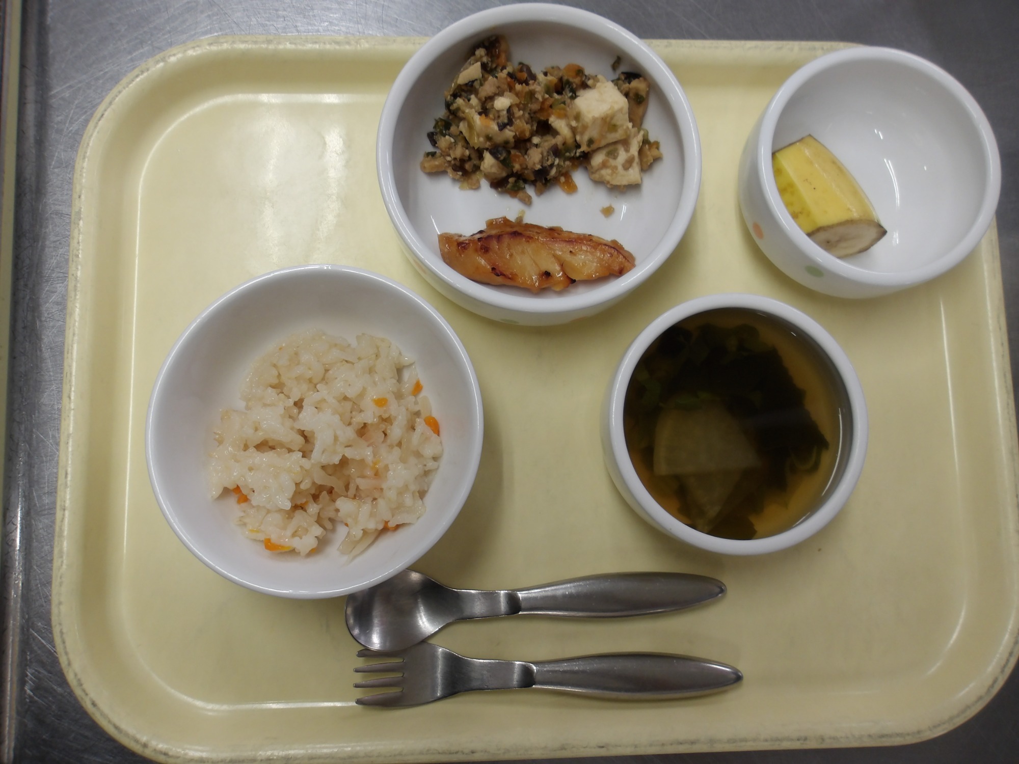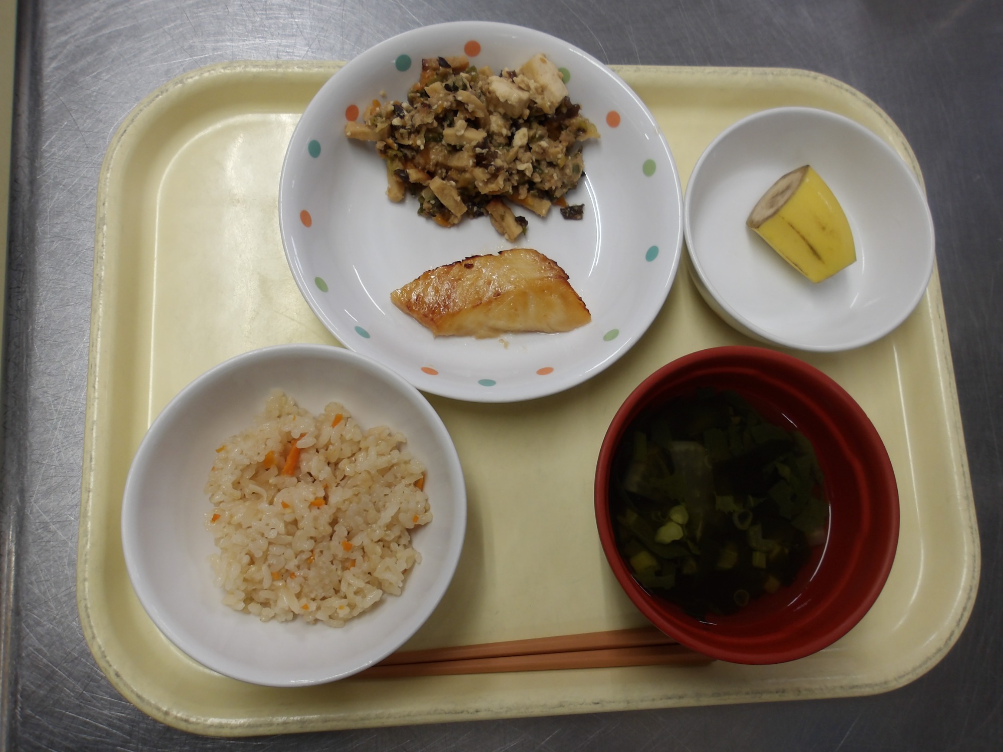 ハリハリごはん(切り干し大根がはいっているよ!) 麻婆豆腐 カレイの煮つけ わかめ汁 バナナ おやつ:ごまおからクッキー