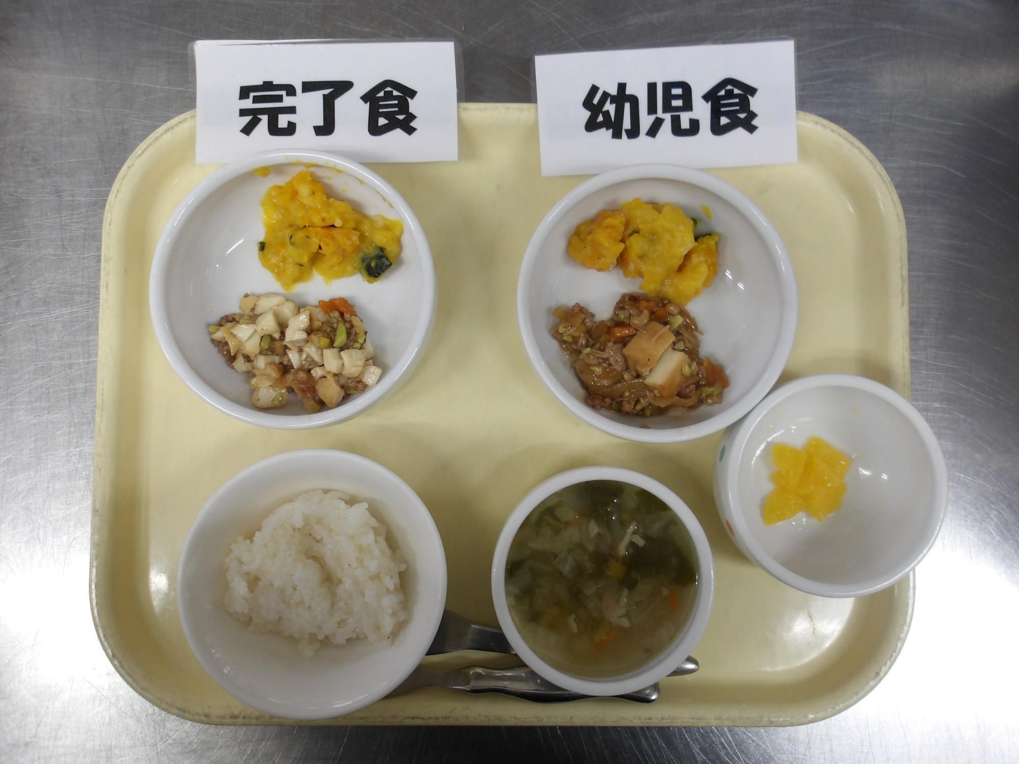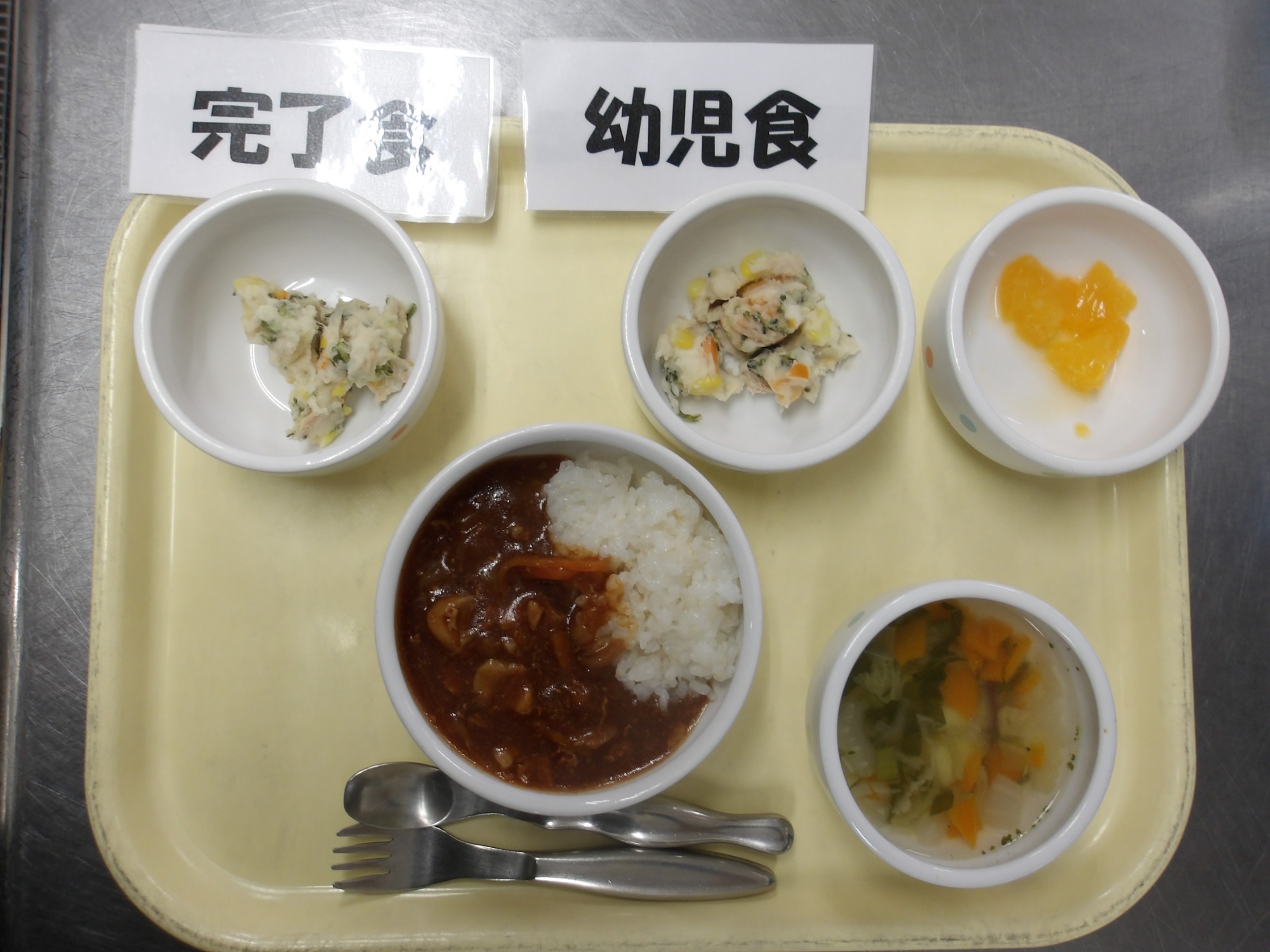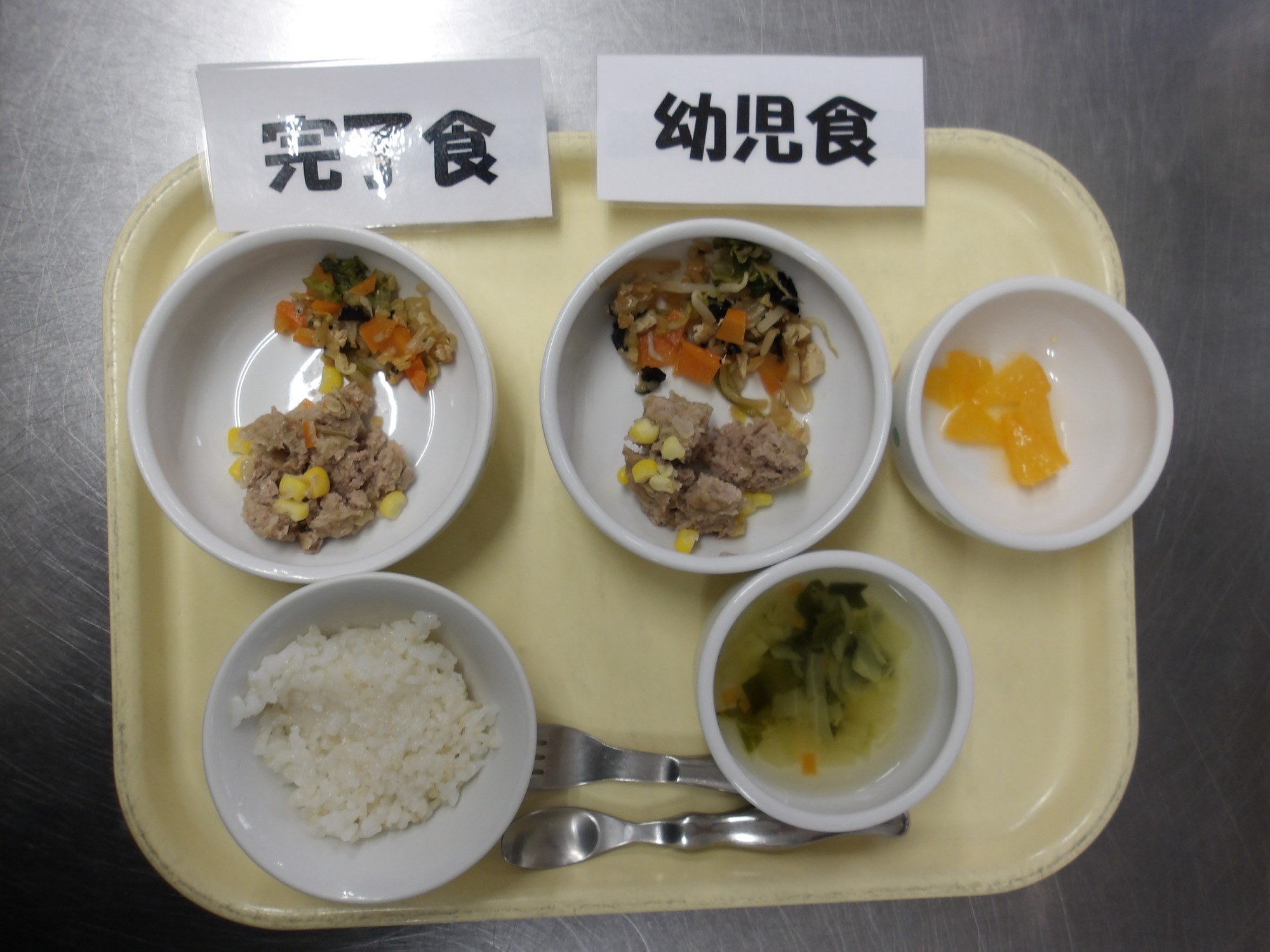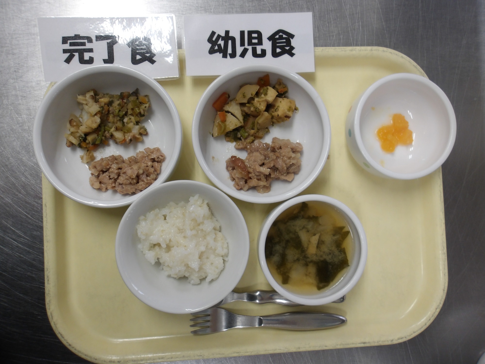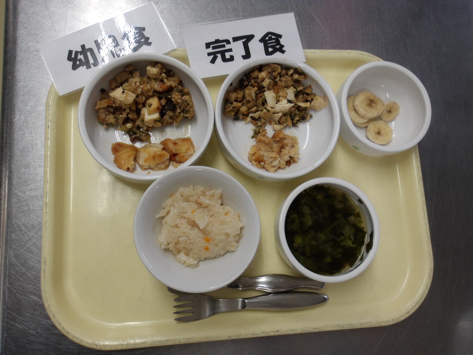 うさぎ組の幼児食と完了食です。前歯の生えてくる状況など一人一人に合わせた形態で提供しています。