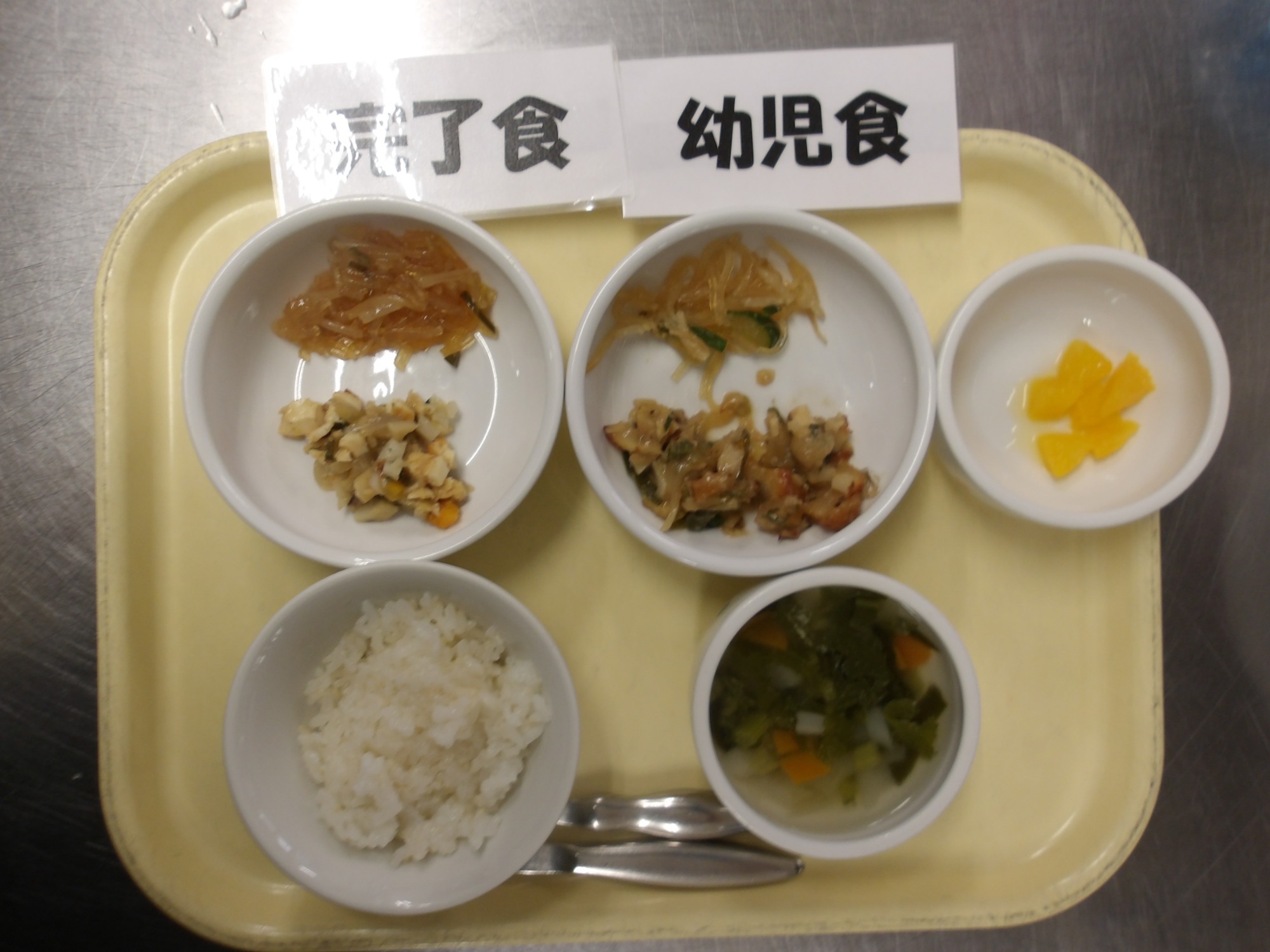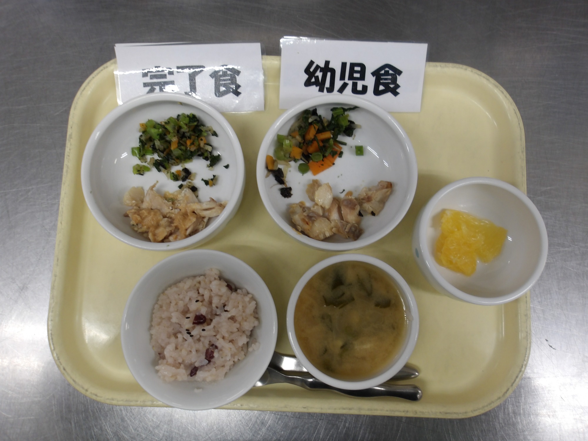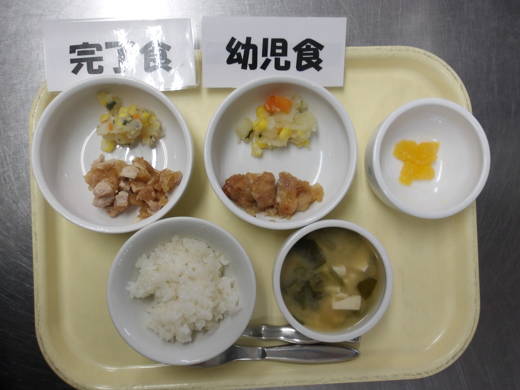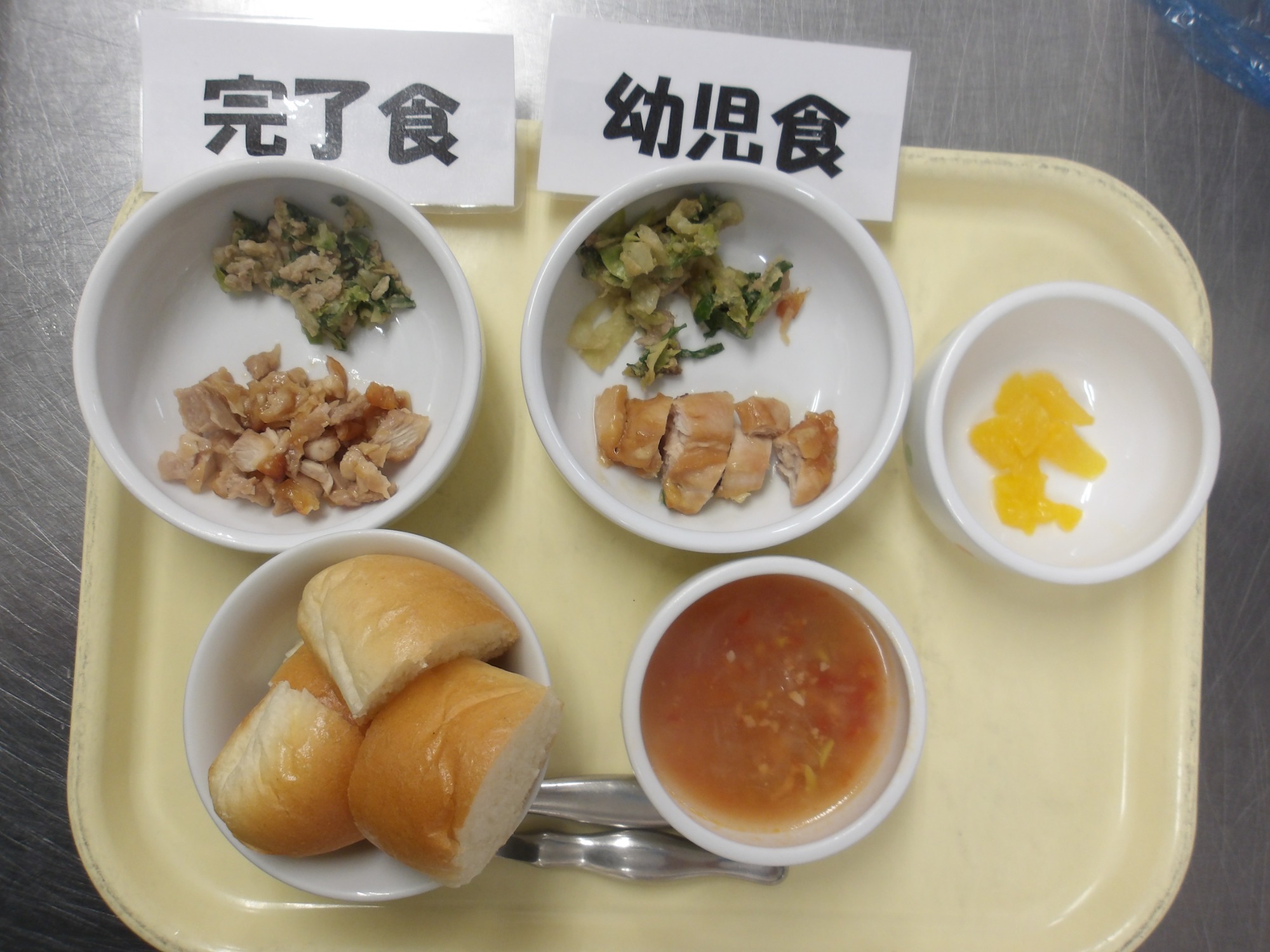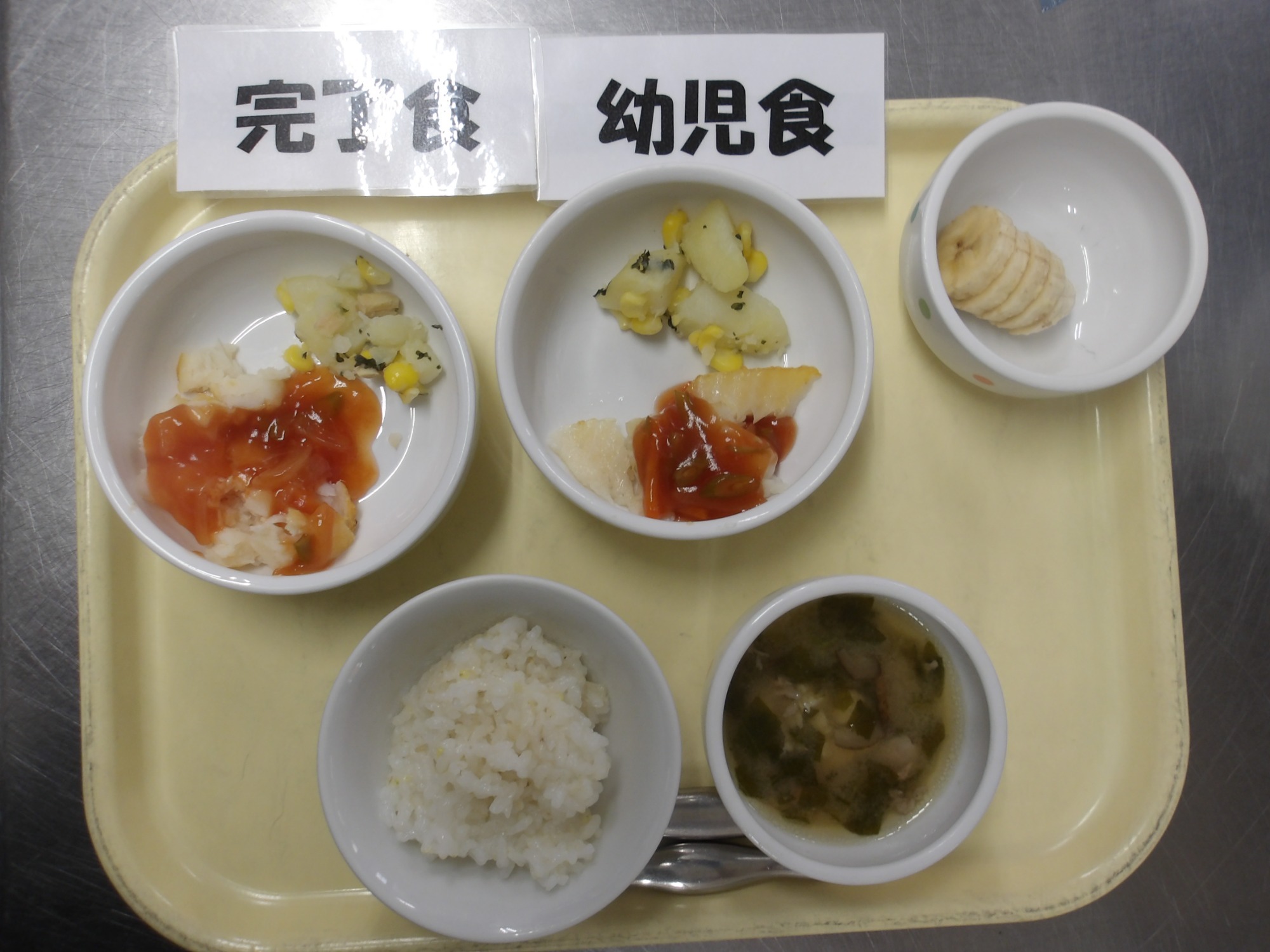 うさぎ組の幼児食と完了食です。前歯の生えてくる状況など一人一人に合わせた形態で提供しています。