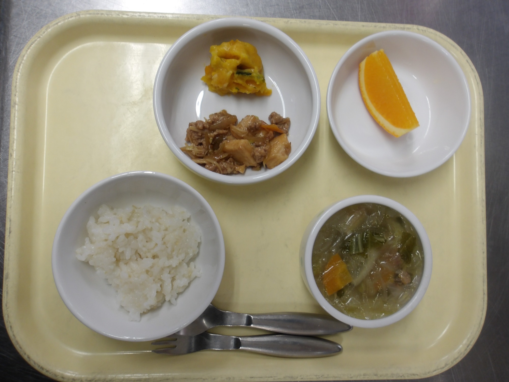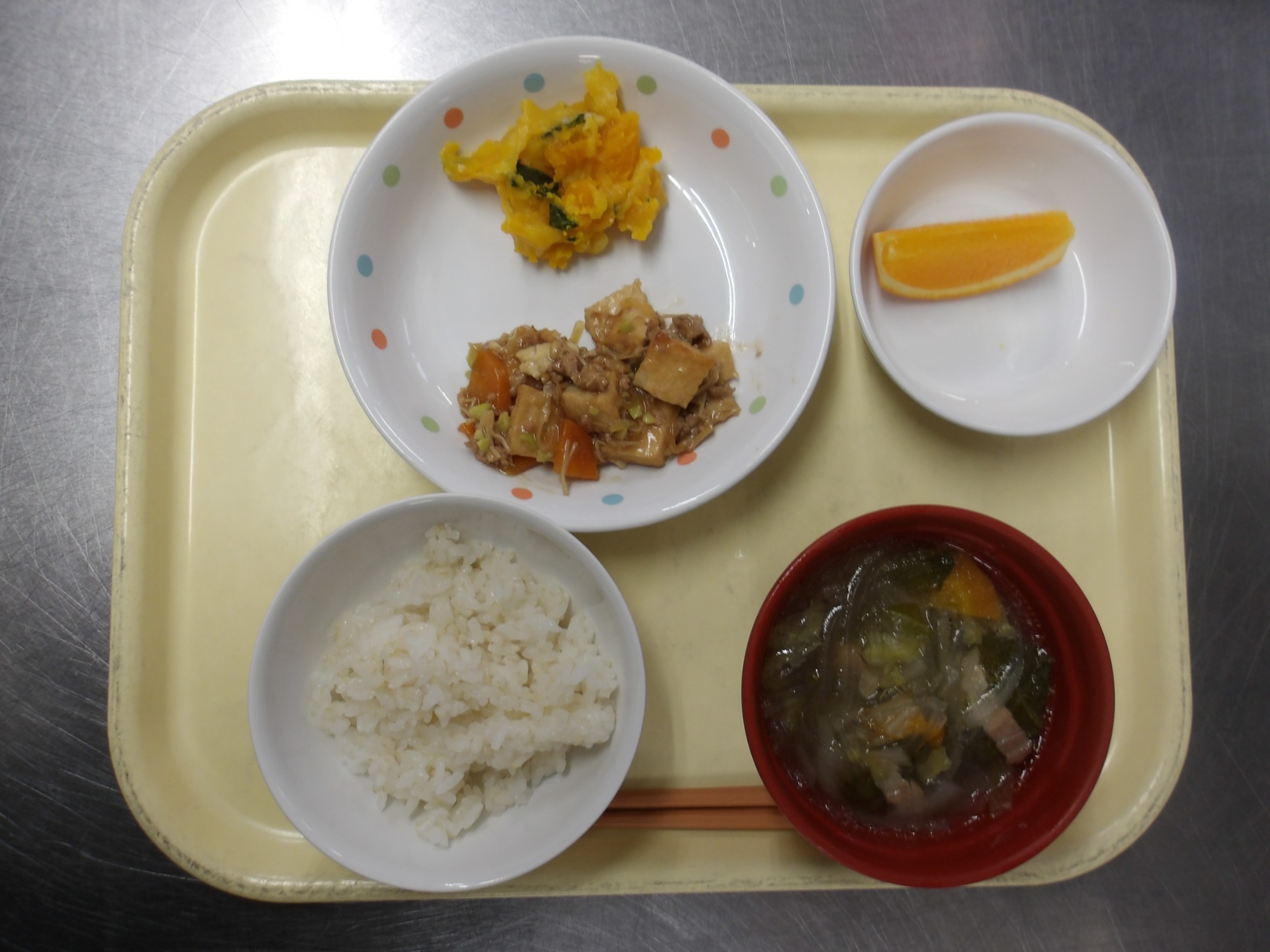 ごはん 厚揚げのそぼろ煮 かぼちゃ豆乳煮 白菜と春雨のスープ オレンジ おやつ:さつまいもクッキー