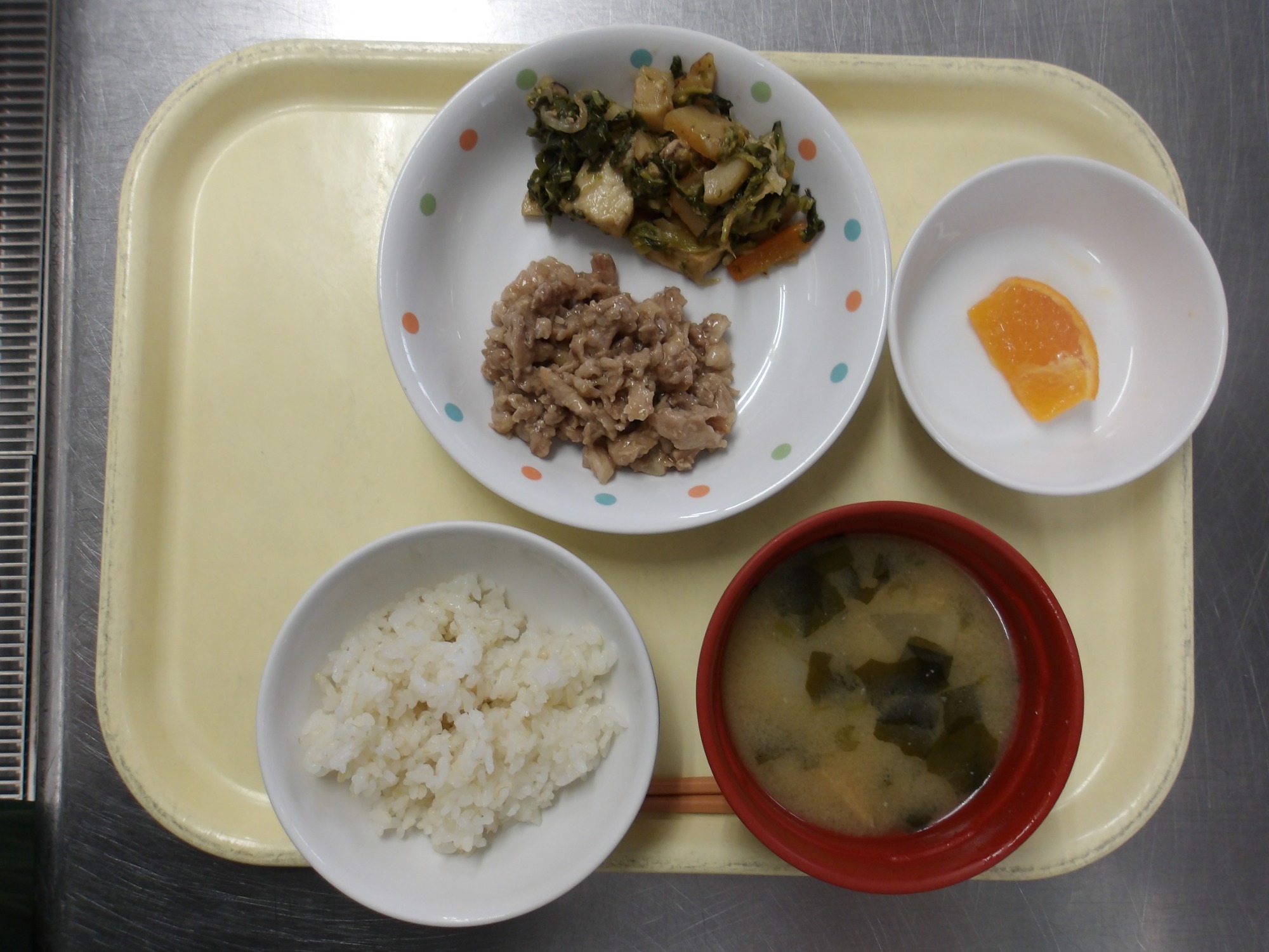 ごはん 豚の生姜焼き 厚揚げと里芋の煮物 カブのみそ汁 麗紅(みかんの仲間) おやつ:黒ゴマドーナツ