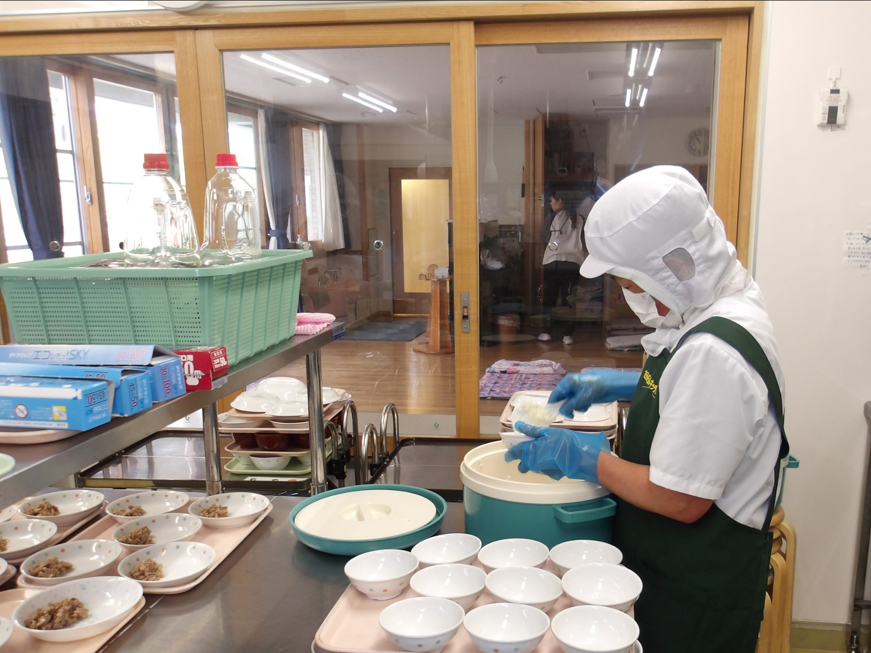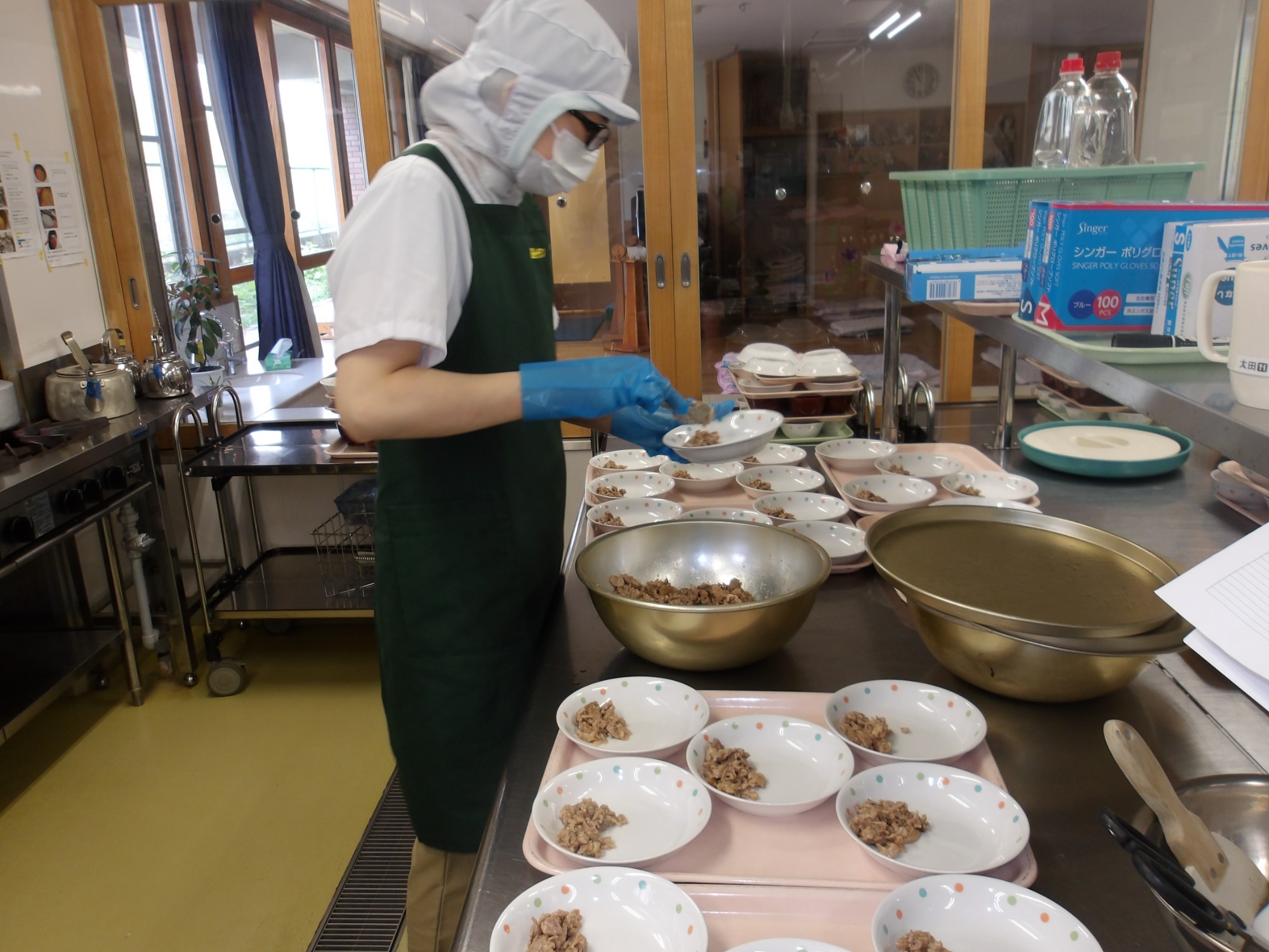 キッチンでの盛り付けの様子です。ひだまり給食の間はキッチンですべて盛り付けをし、お部屋で調整します。