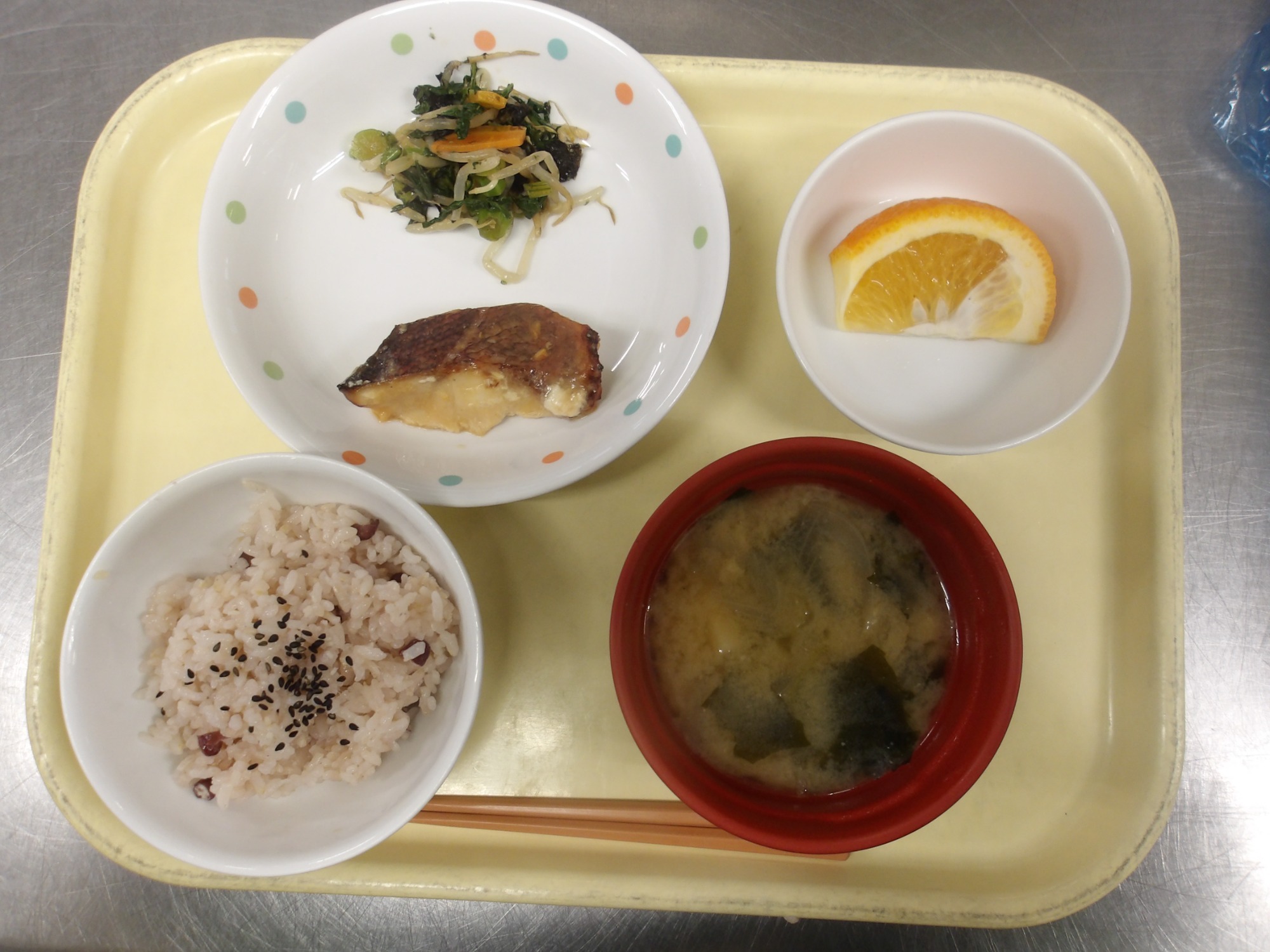 お赤飯 めばるのみそ照り焼き 磯香和え 玉ねぎのみそ汁 紅甘夏 おやつ:ごまおからクッキー