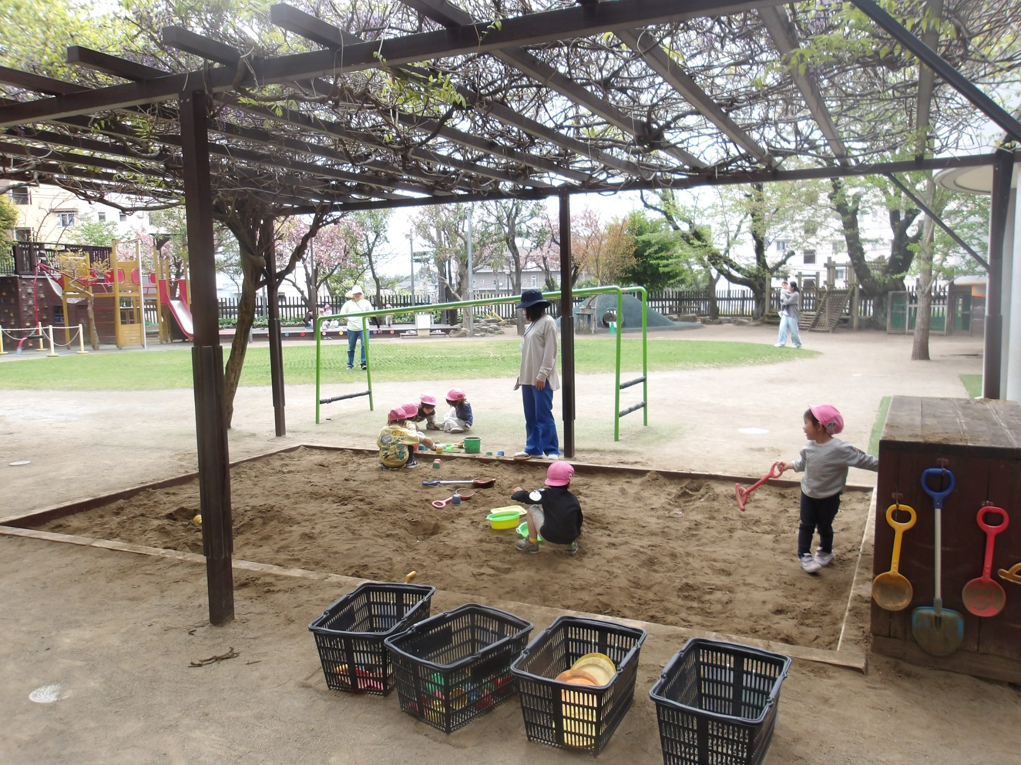 りんご組、お砂場でたくさん遊びました。 砂場の藤棚もお花が咲いていました!!