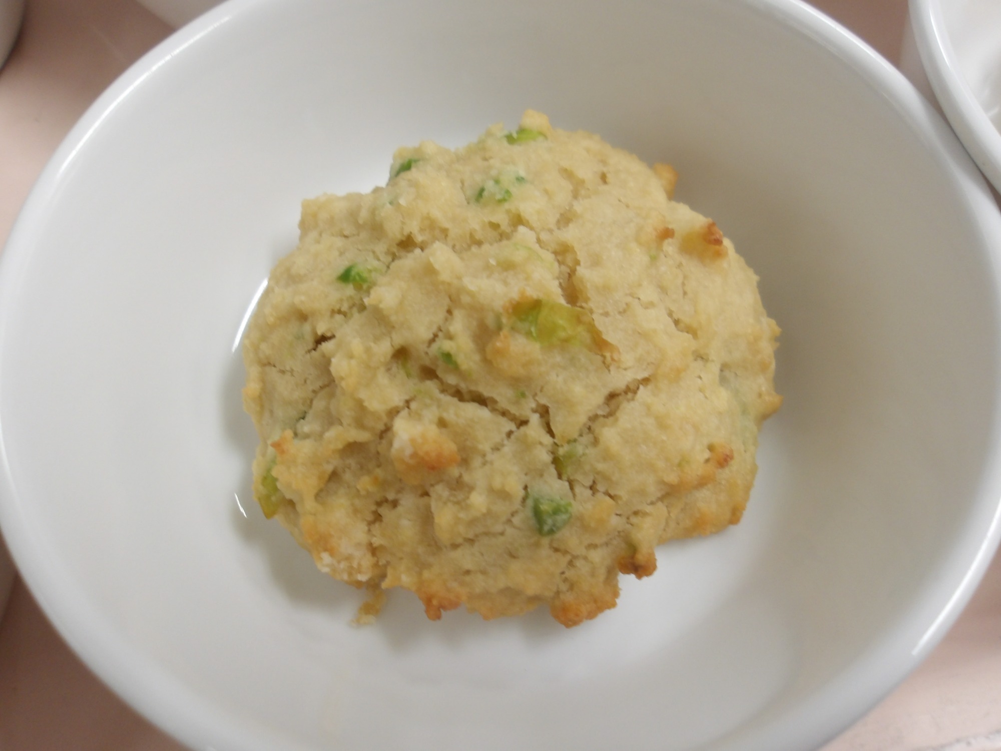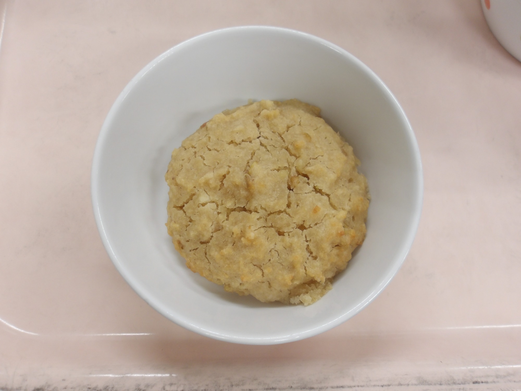 昨日の米粉のケーキのアレンジ版「えだまめケーキ」です。枝豆も誤飲を防ぐために細かく刻んでから使用します。たんぱく質もしっかり摂れるおやつですよ。甘味は甜菜糖。お腹にとっても優しい食材です。