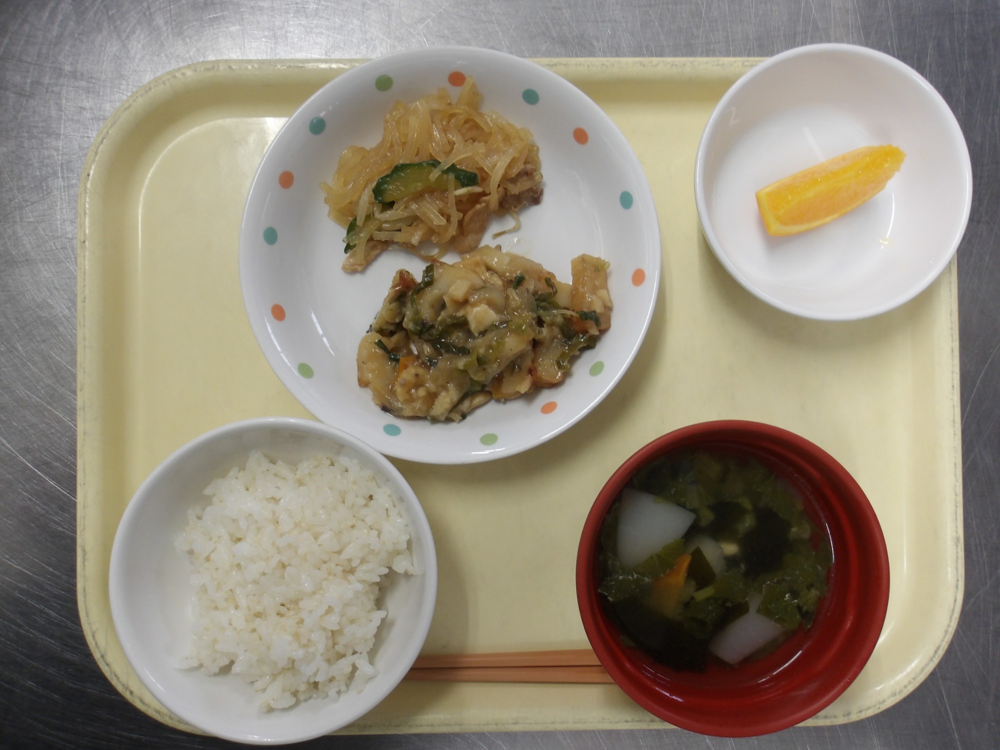 ごはん みそ炒め 春雨サラダ オレンジ 鶏とわかめとかぶのスープ おやつ:えだまめケーキ